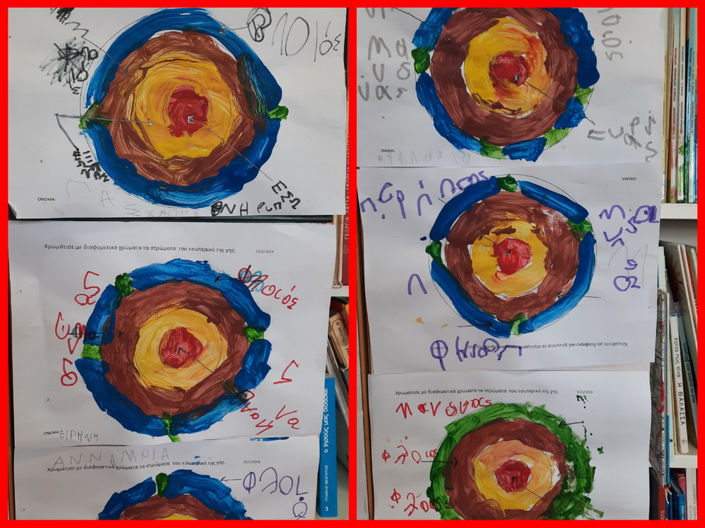 Τα νήπια έπειτα από τα βίντεο παρακολούθησαν, άκουσαν, συζήτησαν, αναπαριστούν το εσωτερικό της γης, αρχικά με ζωγραφική ( πινέλα).
