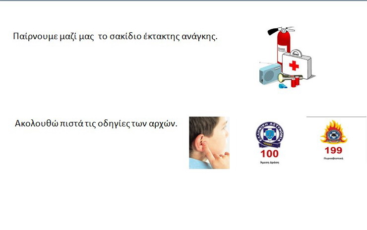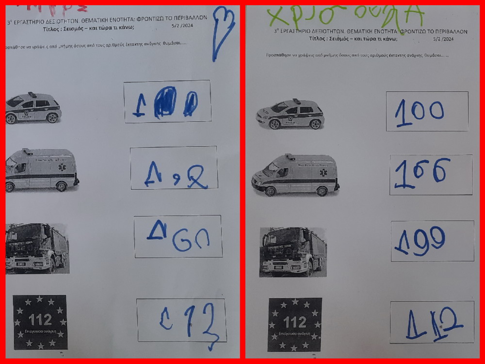Συμπληρώνουμε και ολοκληρώνουμε το εργαστήριο δεξιοτήτων :Σεισμός και τώρα τι κάνω; με επιπλέον δραστηριότητες σχετικές με τις φυσικές καταστροφές που συνολικά αποτελούν το θέμα μας ( πρόγραμμα σχολικών δραστηριοτήτων): “Ενημερώνομαι – μαθαίνω-προστατεύομαι” από φυσικούς κινδύνους-καταστροφές.