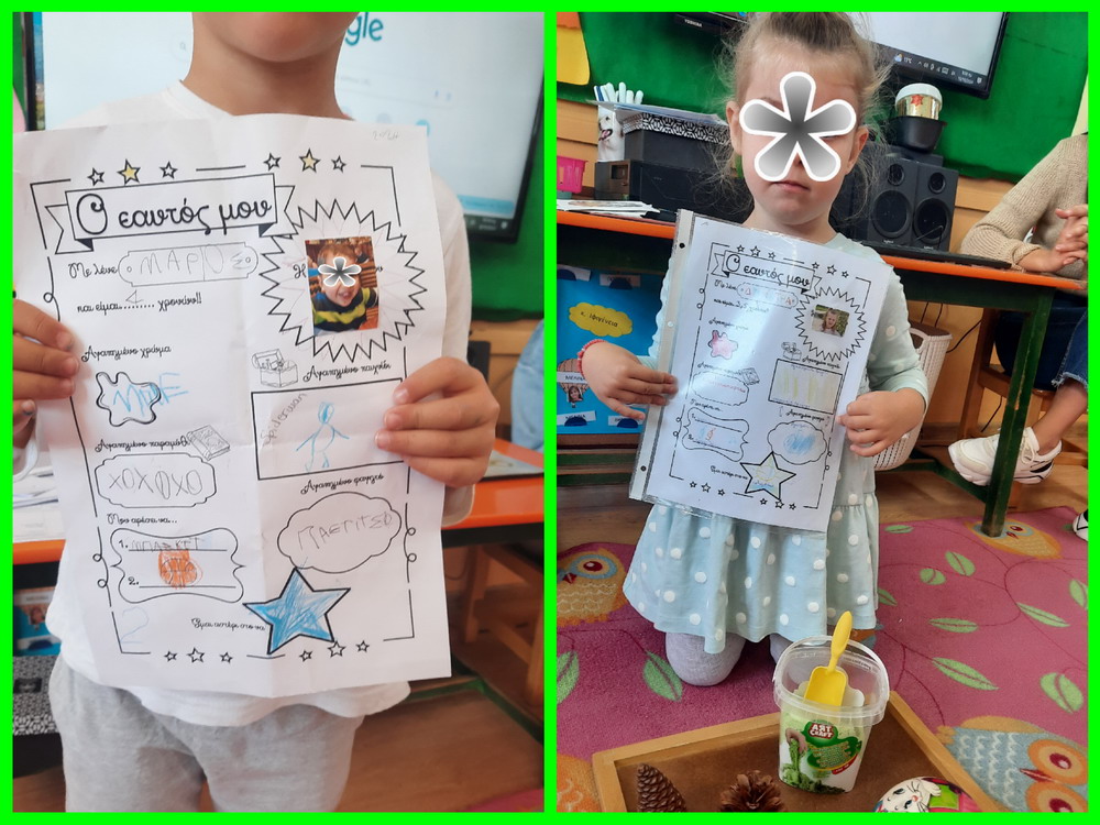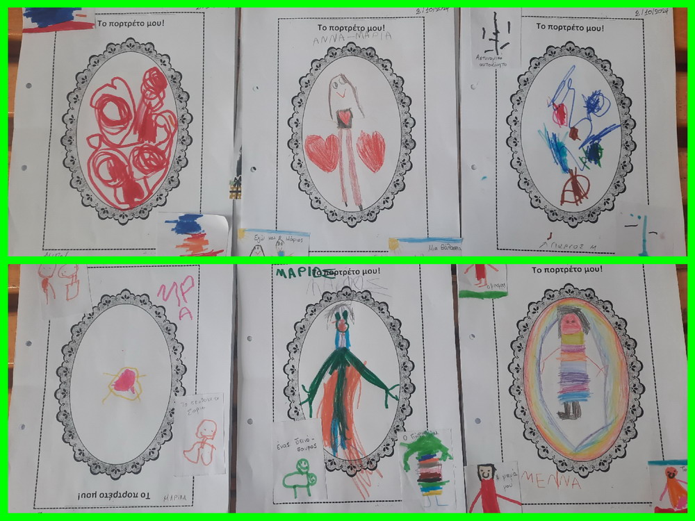 Τα παιδιά δημιουργούν το πορτρέτο τους και το παρουσιάζουν. Ακολουθεί συζήτηση σχετικά με τον εαυτό τους και τα συναισθήματα που νιώθουν γι αυτόν. Παρουσιάζουν τον εαυτό τους στην ολομέλεια. Φέρνουν από το σπίτι αγαπημένα αντικείμενα ,παιχνίδια και μιλούν γι αυτά. Τα παιδιά τοποθετούν τα πορτρέτα τους στο χώρο της ομάδας . Έπειτα τους δίνουμε χαρτάκια για να ζωγραφίσουν σε κομμάτια τα αγαπημένα τους πράγματα, πρόσωπα, μέρη και να κολλήσουν τις εικόνες γύρο από το πορτρέτο τους.