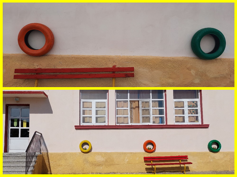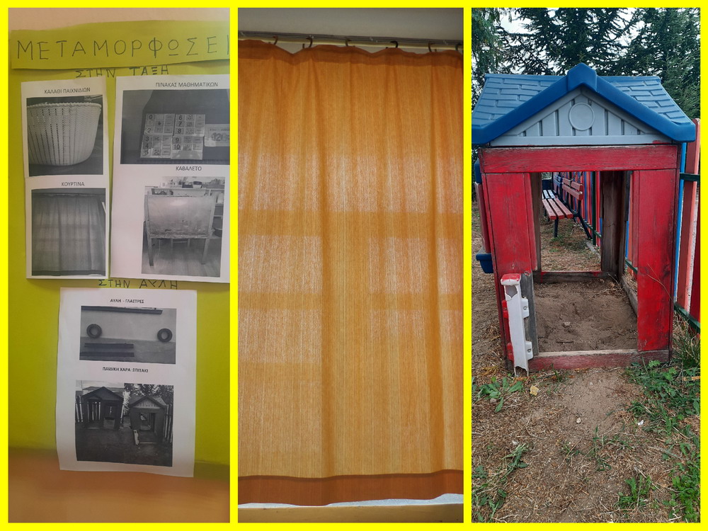 Έπειτα φωτογραφίζουμε αυτά τα «άσχημα σημεία» του σχολείου τους και τα κολλάμε σε χαρτόνι .Τα παιδιά ονειρεύονται πως μπορούν να μεταμορφώσουν αυτή την άσχημη εικόνα σε μια όμορφη, όλοι μαζί…… Προτείνουν τρόπους για να μεταμορφωθούν οι άσχημες εικόνες……( η παλιά κουρτίνα, το φθαρμένο σπιτάκι, οι άδειες γλάστρες, 0 πίνακας μαθηματικών κ.αλ.)