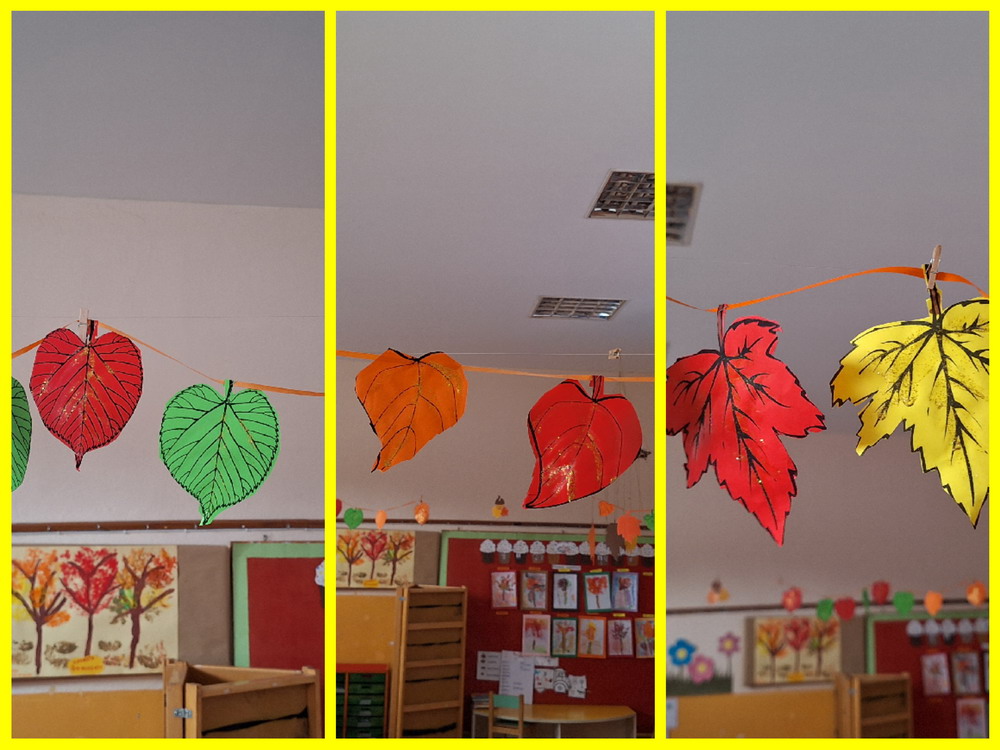 Κόβουμε φύλλα διαφόρων μεγεθών και τα κρεμούμε στα παράθυρα στην αίθουσα….