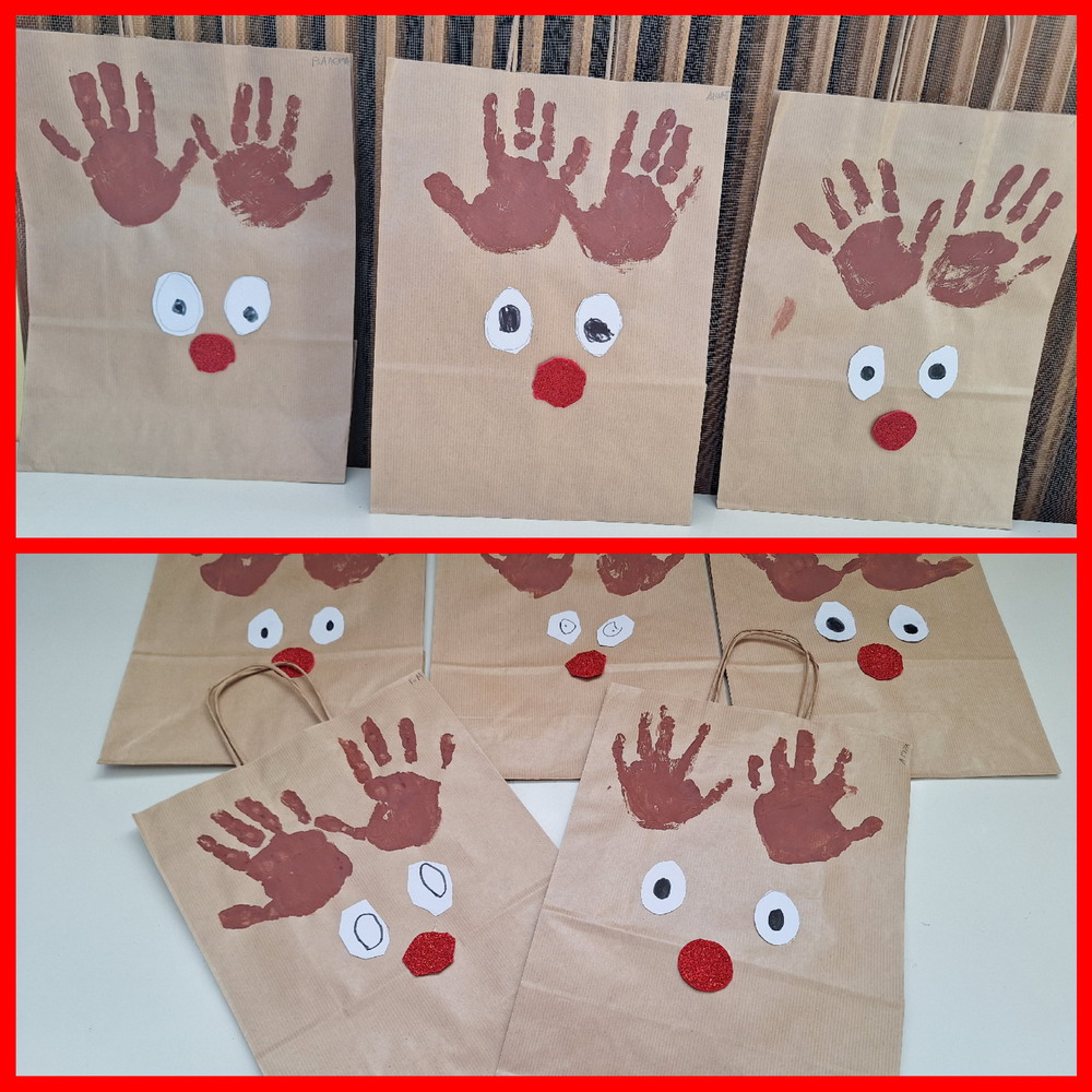 Διακοσμούμε τις χάρτινες τσάντες και τοποθετούμε για να τοποθετήσουμε τις κατασκευές μας………………..