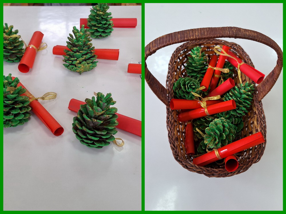 Οι πρωτότυπες προσκλήσεις μας με τις κουκουνάρες βαμμένες και διακοσμημένες από τα παιδιά.