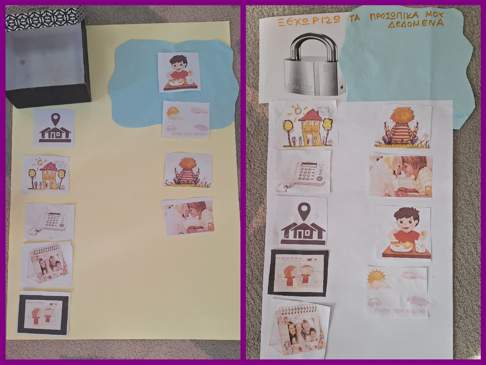 Συζητάμε με τους μικρούς μαθητές για τα προσωπικά δεδομένα ποια είναι ; πρέπει να τα ανακοινώνω στους αγνώστους ή να τα προστατεύω;;;Κλείνω κάπου με ασφάλεια ή κλειδώνω τα προσωπικά μου δεδομένα σε αντίθεση με εικόνες που δείχνουν ασήμαντες πληροφορίες. Προσωπικά δεδομένα: η διεύθυνση του σπιτιού μου, το σχολείο μου, οι φωτογραφίες μου, το ονοματεπώνυμο μου, ο αριθμός του τηλεφώνου μου…………