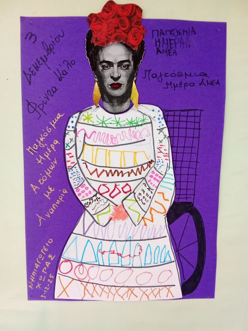Δώσαμε κι εμείς το δωράκι που φτιάξαμε. Μία αφίσα με την Φρίντα Κάλο, την υπέροχη ζωγράφο με αναπηρία που αγαπούσε πολύ τα ζώα (κολάζ με τη μέθοδο zentagle).