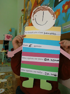 Ξεκινήσαμε να μιλάμε για τον εαυτό μας κάνοντας μια ατομική εργασία με κάποια βασικά στοιχεία όπως το όνομά μας, την ηλικία μας, τι μας αρέσει να τρώμε και να παίζουμε.