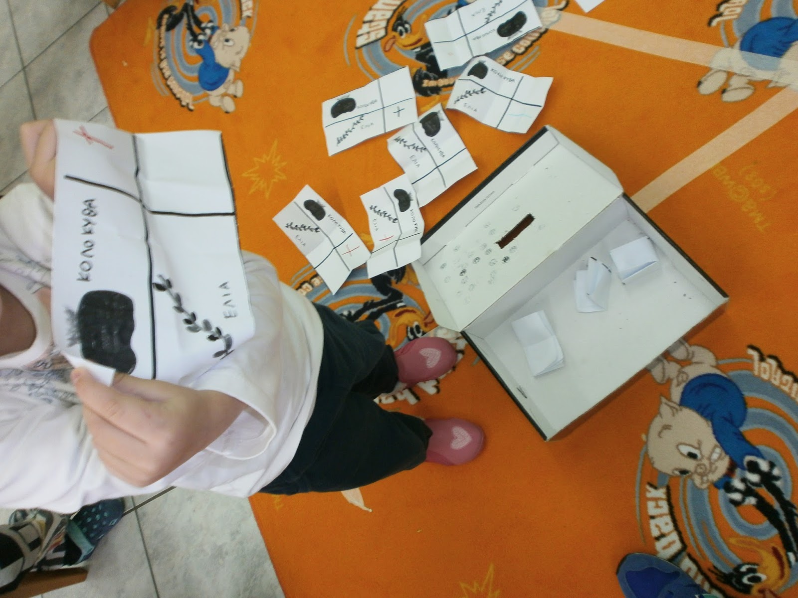 Η ανάγνωση του παραμυθιού η “Σοφή Ελιά”, μας έδωσε την ευκαιρία να κάνουμε εκλογές στη τάξη μας. Συζητήσαμε για το πως πρέπει να ψηφίζουμε και φτιάξαμε ένα “αυτοσχέδιο” εκλογικό κέντρο.