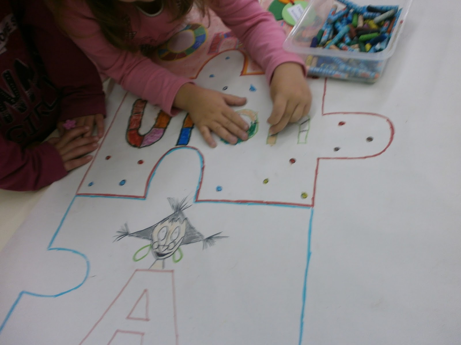 Ξεκινήσαμε φτιάχνοντας ένα παζλ, όπου το κάθε κομμάτι του γράφει απο μια λέξη (once upon a time-Μια φορά κι εναν καιρό). Το κάθε νηπιαγωγείο θα ζωγραφίσει και θα στολίσει το ένα κομμάτι και στο τέλος θα τα ενώσουμε.