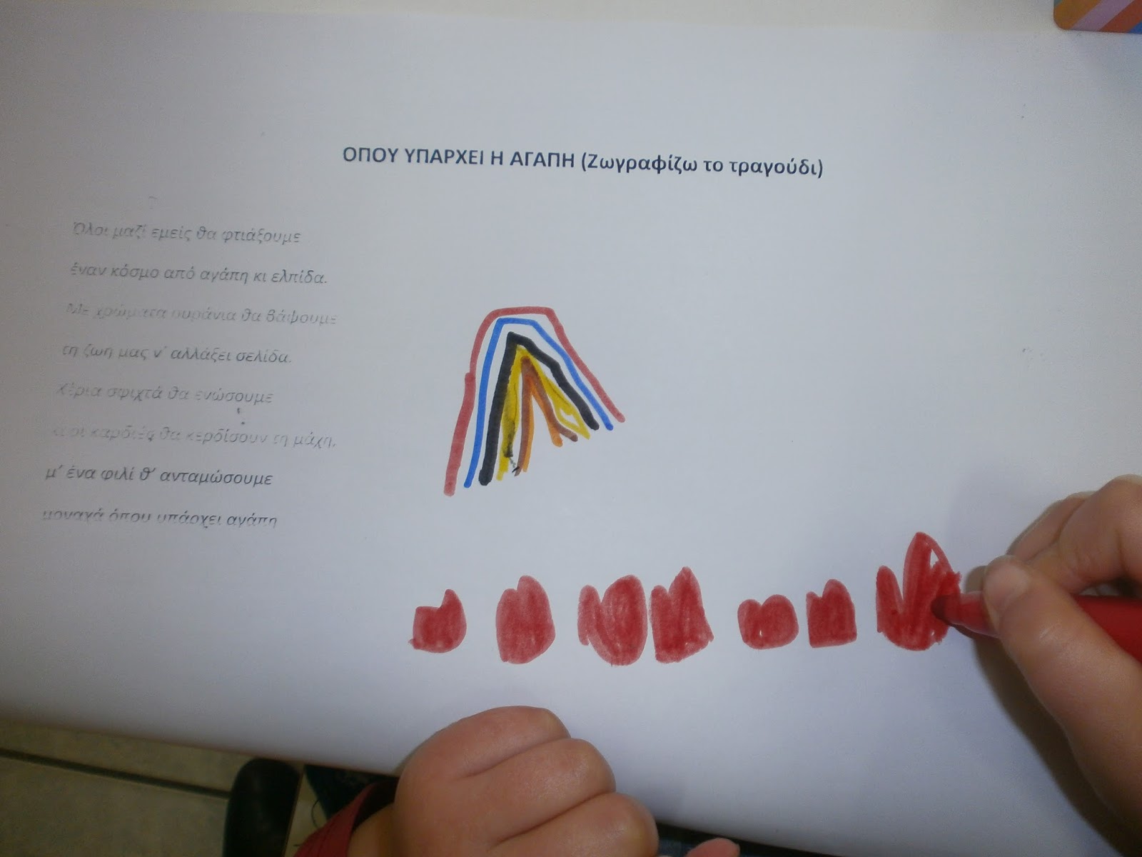 Μας έφερε όμως μία έκπληξη και έτσι έπρεπε να ψάξουμε σε ποια τσέπη την είχε κρυμμένη….Βρήκαμε λοιπόν ένα χαρτί που έγραφε ένα τραγούδι. Ψάξαμε στο ίντερνετ για να το ακούσουμε και επειδή μας άρεσε πολύ αποφασίσαμε να το μάθουμε!Είναι το “Όπου υπάρχει αγάπη” και είναι ένα πολύ γλυκό και συγκινητικό τραγούδι!