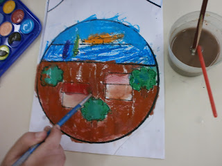 Συζητήσαμε και ζωγραφίσαμε τις φάσεις της ημέρας : Πρωί, μεσημέρι, απόγευμα και βράδυ. Χρησιμοποιήσαμε ως υλικά τις κηρομπογίες και απο πάνω τις νερομπογιές για ένα πιο αποτελεσματικό και καλύτερο αποτέλεσμα.