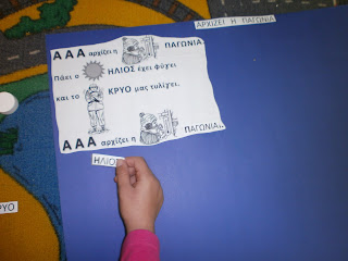 Μάθαμε ένα χειμωνιάτικο τραγουδάκι που ονομάζεται ” Α,α, α αρχίζει η παγωνιά”. Είναι εύκολο στην εκμάθησή του, εξαιτίας στης συχνής επανάληψης κάποιων φωνηέντων. Με την ευκαιρία κάναμε και μια αντιστοίχηση λέξεων.