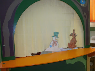 Διαβάσαμε μια ιστορία με ένα χιονάνθρωπο που κρύωνε πολύ, όμως συνάντησε κάποιους φίλους στο δάσος που τον βοήθησαν… Τα παιδιά εξέφρασαν την επιθυμία να παίξουν την ιστορία στο κουκλοθέατρο. Επίσης η ιστορία αυτή δεν ήταν εικονογραφημένη, έτσι αποφασίσαμε να γίνουμε εμείς οι εικονογράφοι και να το ζωγραφίσουμε. Το αποτέλεσμα ήταν πολύ όμορφο και το παραμύθι μας μπήκε στη βιβλιοθήκη!