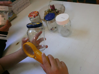 Φτιάξαμε τη γωνιά των μικρών εξερευνητών και με το μεγενθυτικό φακό αρχίσαμε την εξερεύνηση των εντόμων και των λουλουδιών! Προσθέσαμε και μερικές εγκυκλοπαίδειες για να μάθουμε περισσότερα πράγματα.