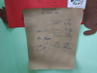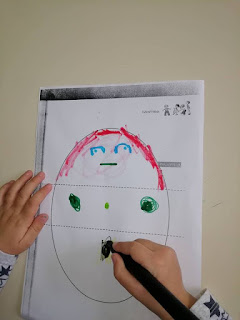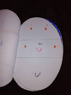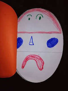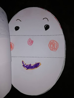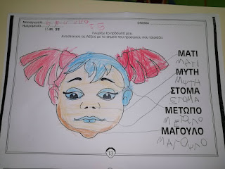 Φτιάξαμε το βιβλίο με τα αστεία πρόσωπα. το κάθε παιδάκι ζωγράφισε το πρόσωπό του, κόψαμε σε τρία μέρη το πρόσωπο και τα δέσαμε…γυρνούσαμε τη σελίδα και επιλέγαμε τα μάτια ενός παιδιού, τη μύτη άλλου και το στόμα τρίτου παιδιού,..έτσι δημιουργούνταν ένα νέο πρόσωπο.