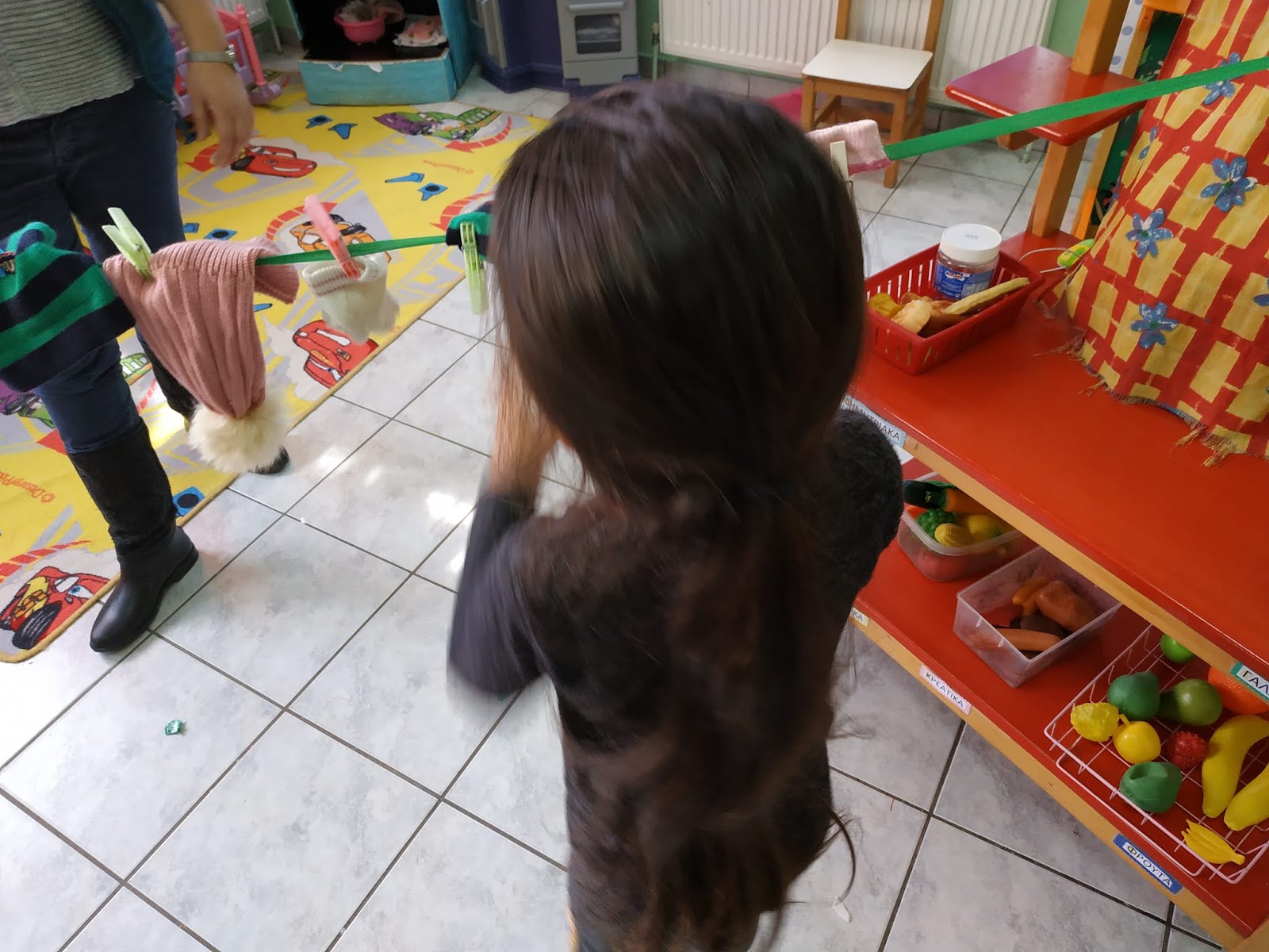 Και το παιχνίδι ξεκινά..χωριζόμαστε σε δύο ομάδες…ποια ομάδα θα κρεμάσει πρώτα τα κασκόλ, τα γάντια και τα σκουφάκια; Τι χρειαζόμαστε για να νικήσουμε; Συνεργασία, ταχύτητα και να είμαστε συγκεντρωμένοι. Ξεκινάμε!