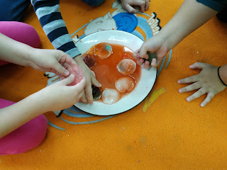 Τα πειράματα συνεχίζονται..ας φτιάξουμε και εμείς παγάκια χρωματιστά. Με χαρτί γκοφρέ και μαρκαδόρους χρωματίζουμε το νερό και το τοποθετούμε στην κατάψυξη. περιμένουμε μέχρι την άλλη μέρα.