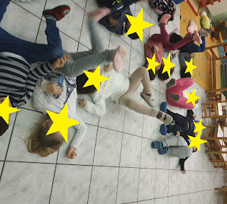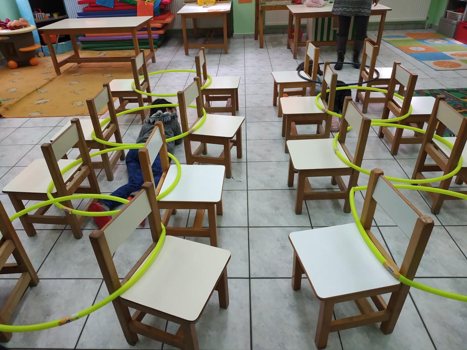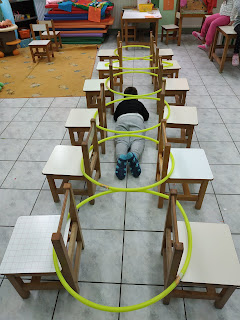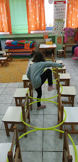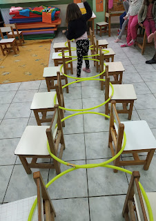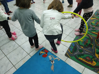 3)Κάνουμε ένα μεγάλο κύκλο, και προσπαθούμε να περάσουμε το στεφάνι στο διπλανό μας, χωρίς να αφήσουμε τα χέρια..πρώτα πόδι, βοηθάμε με το χέρι, περνάει το κεφάλι….