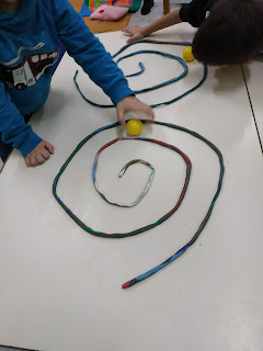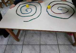 7)Ας χαλαρώσουμε λίγο. Φτιάχνουμε με πλαστελίνη δύο σαλιγκάρια, και τοποθετούμε δύο μπαλάκια στην αρχή της διαδρομής. Αρχίζουμε και φυσάμε το μπαλάκι, με σκοπό να φτάσει στο κέντρο του σαλίγκαρου.