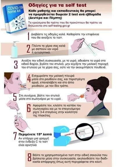 Οι γονείς/κηδεμόνες θα πραγματοποιούν στα παιδιά τους (μαθητές του Νηπιαγωγείου) το SELF–TEST σύμφωνα με τις οδηγίες που αναγράφονται σε κάθε συσκευασία.