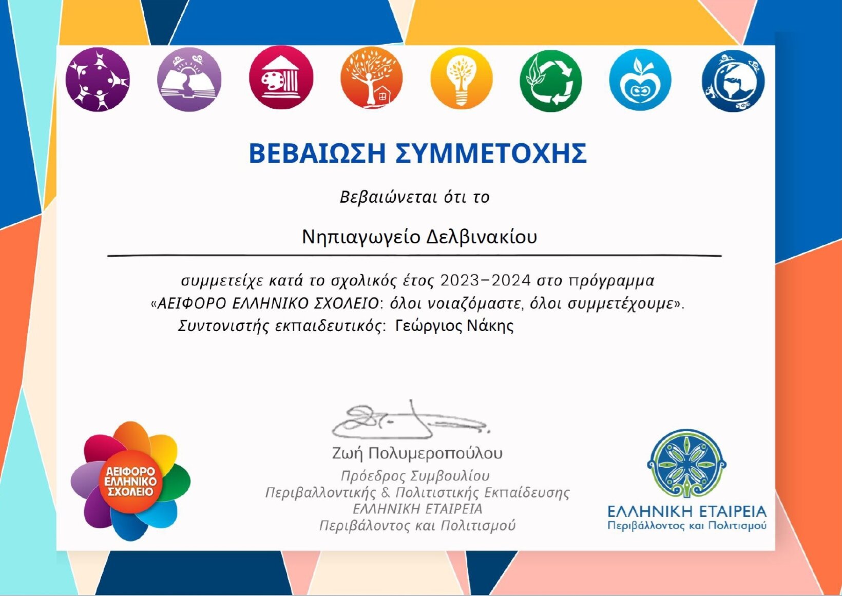 Το Νηπιαγωγείο Δελβινακίου από το σχολικό έτος 2023-24 συμμετέχει στο πρόγραμμα “Αειφόρο Ελληνικό Σχολείο“, αναπτύσσοντας μεταξύ άλλων δράσεις για το περιβάλλον, την πολιτιστική κληρονομιά, τη δημοκρατία, τις τέχνες κ.ά.