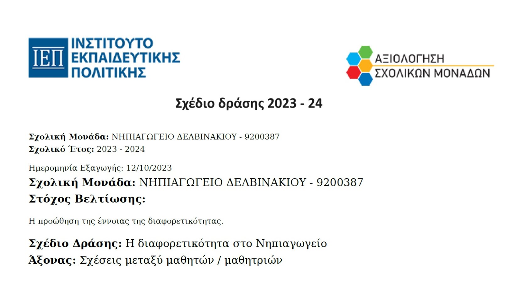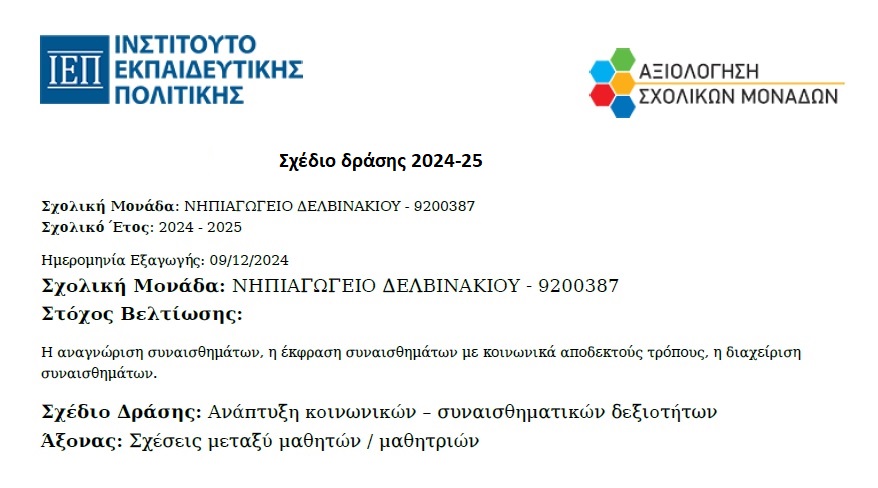 Σχέδιο Δράσης Παρατίθενται τα σχέδια δράσης που εκπονεί η σχολική μονάδα ανά σχολικό έτος, κατά τα οριζόμενα στο άρθρο 33 του ν.4692/2020. Σχέδιο Δράσης 2024 – 2025 Σχέδιο Δράσης 2023 – 2024