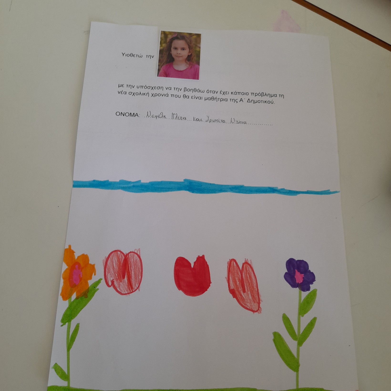 - Τα νήπια αποδέχονται την πρόσκληση και κάθε παιδί της Ε΄ τάξης υιοθετεί από ένα νήπιο με την υπόσχεση, την επόμενη σχολική χρονιά, να το βοηθά όταν το χρειάζεται.