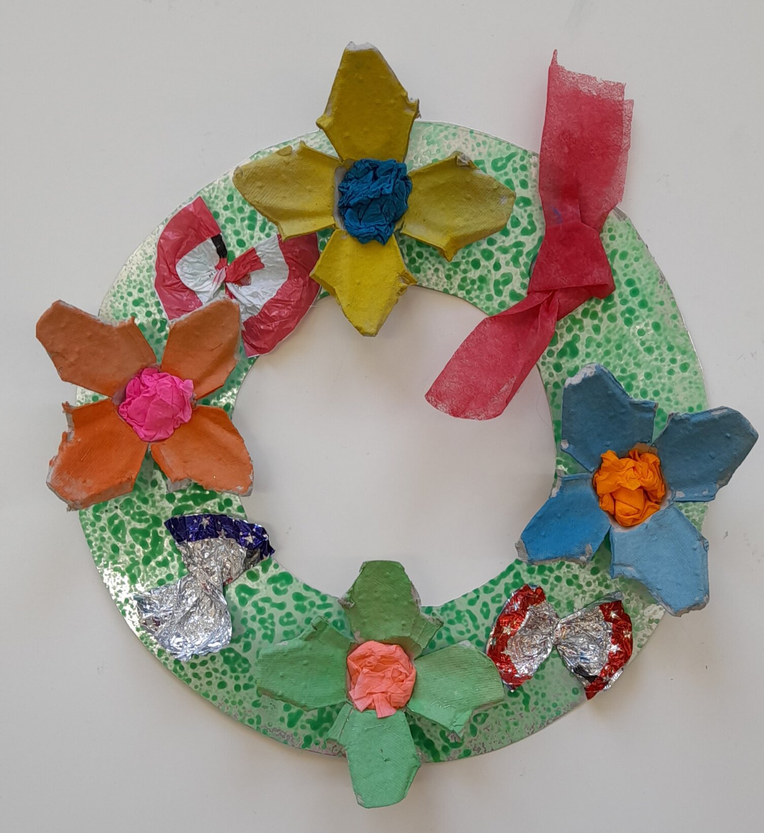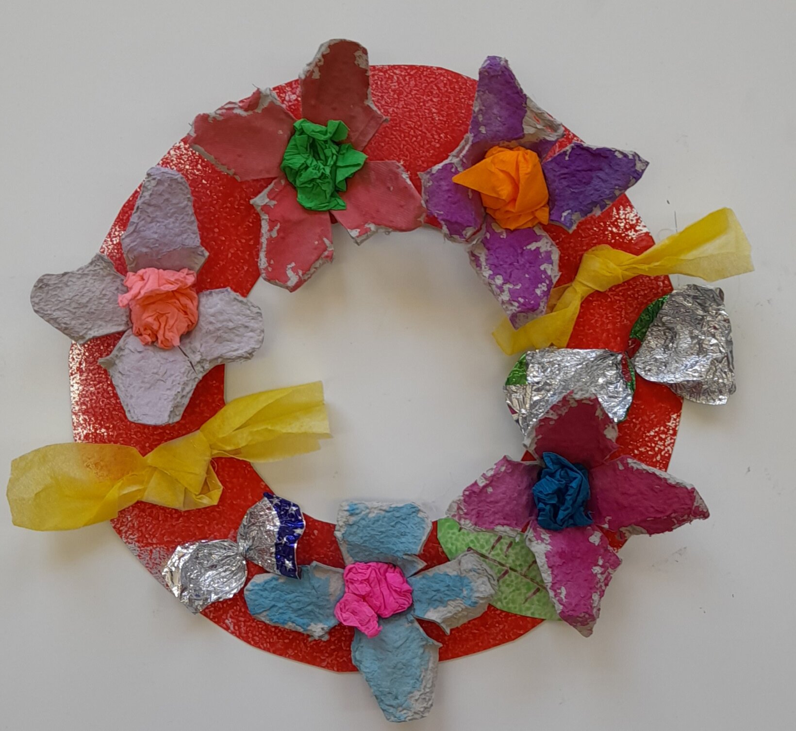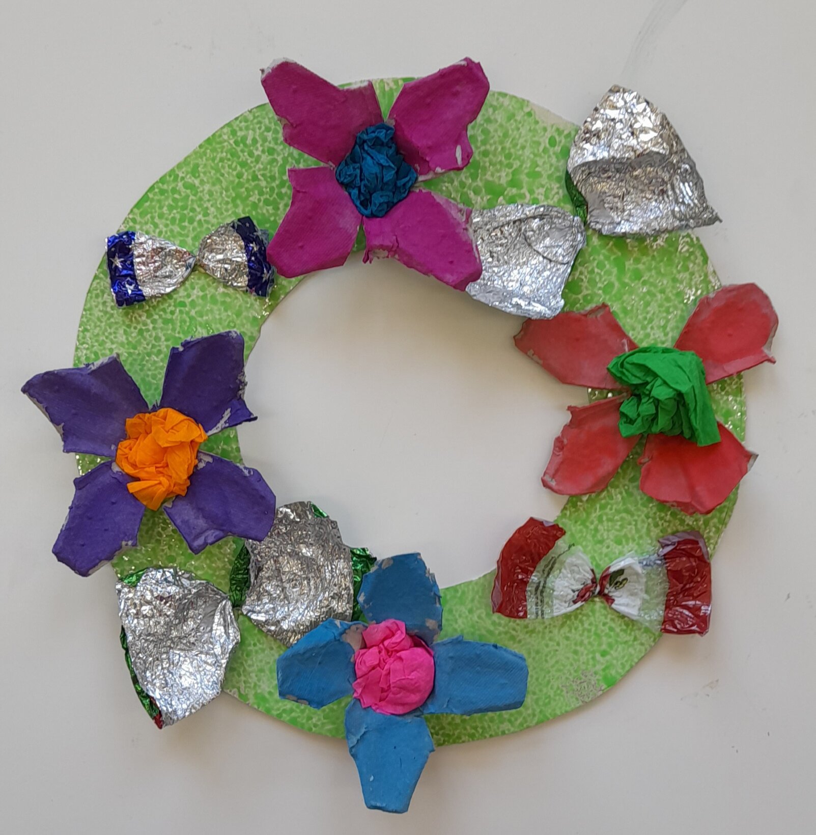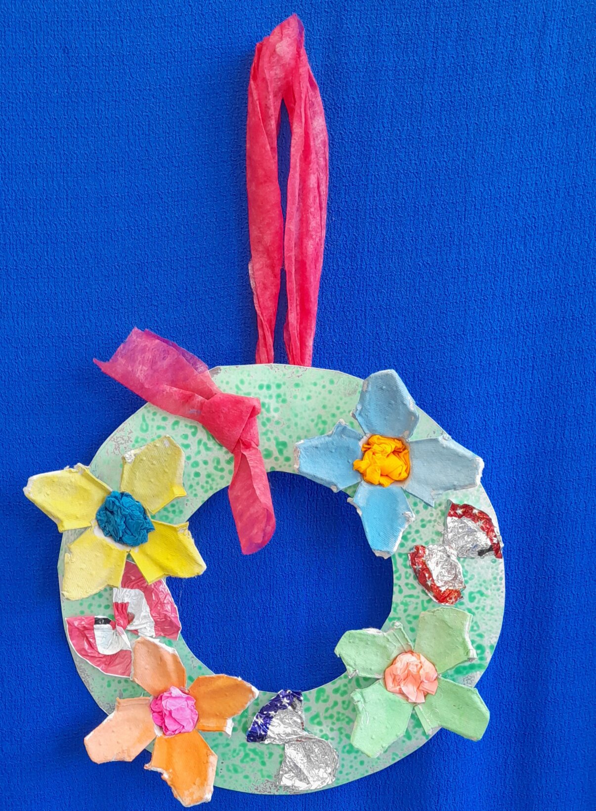 Τα παιδιά υποδέχθηκαν το Μάη …λίγο νωρίτερα , φτιάχνοντας πρωτομαγιάτικα στεφάνια από ανακυκλώσιμα υλικά . Το στεφάνι από τυπώματα με σφουγγάρι και τα λουλούδια από χάρτινες αβγοθήκες βαμμένες με τέμπερες . Συμπλήρωσαν τη σύνθεση πεταλούδες , από καραμελόχαρτα αφού πρώτα… καταναλώθηκε το περιεχόμενό τους!!!