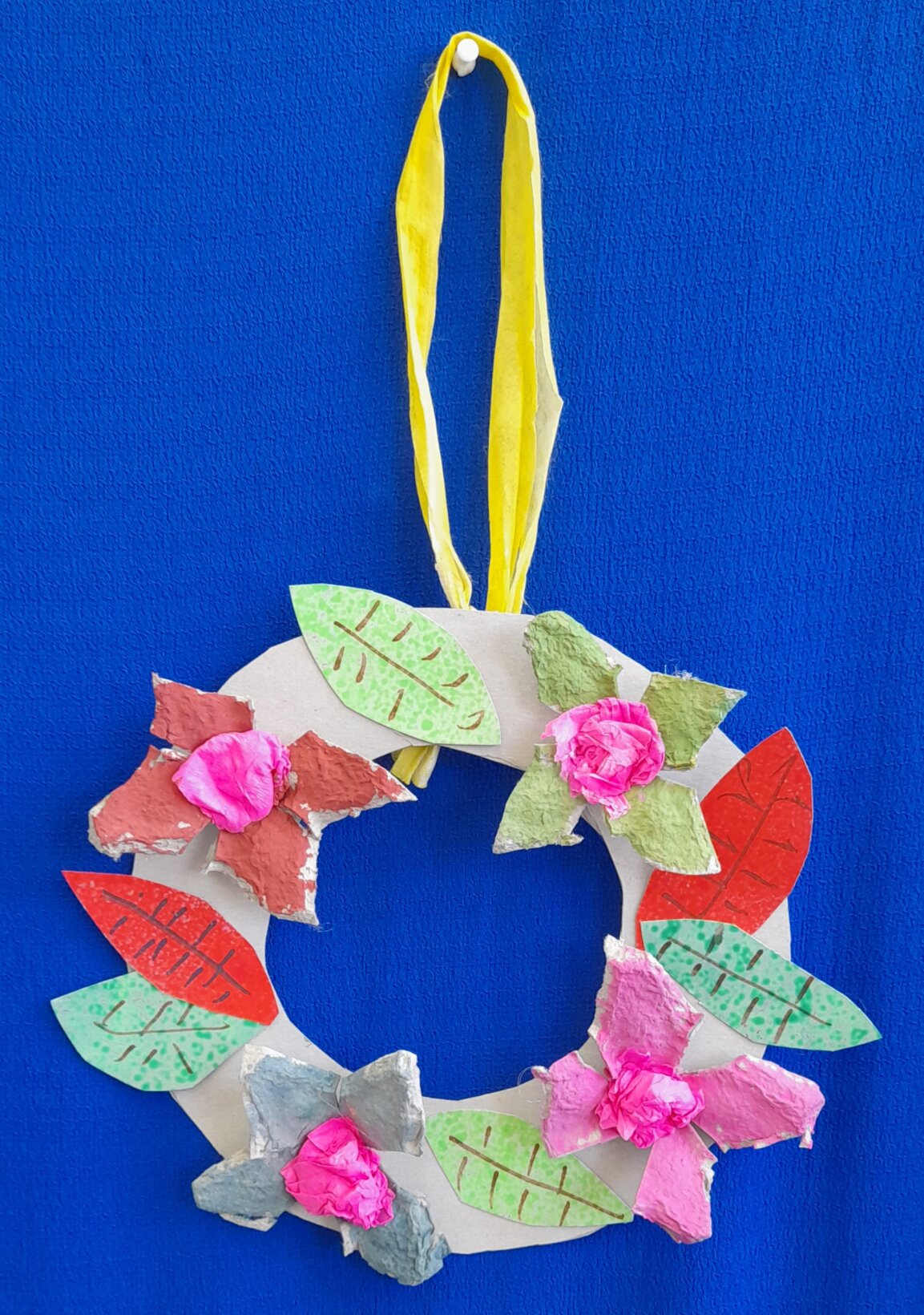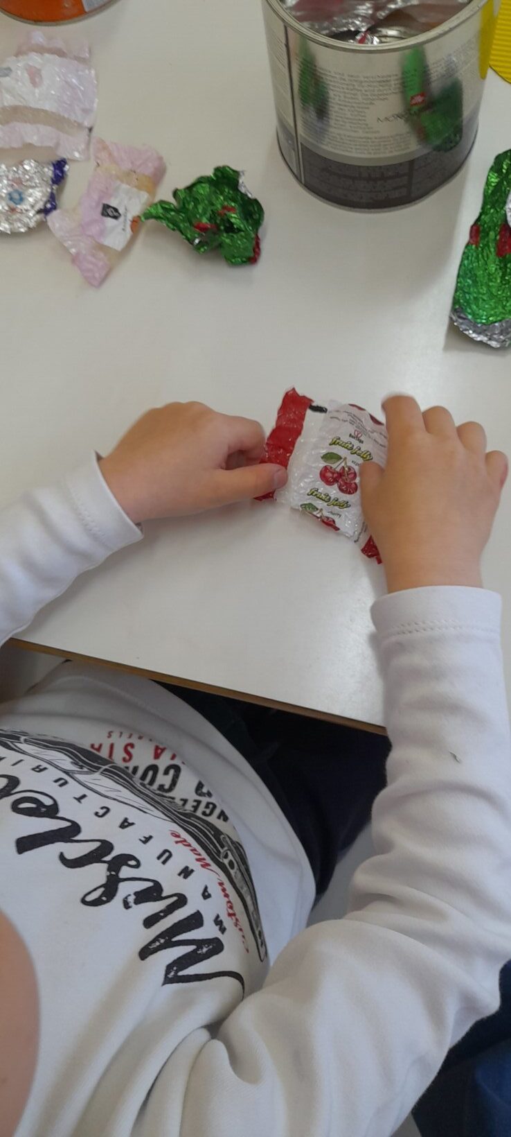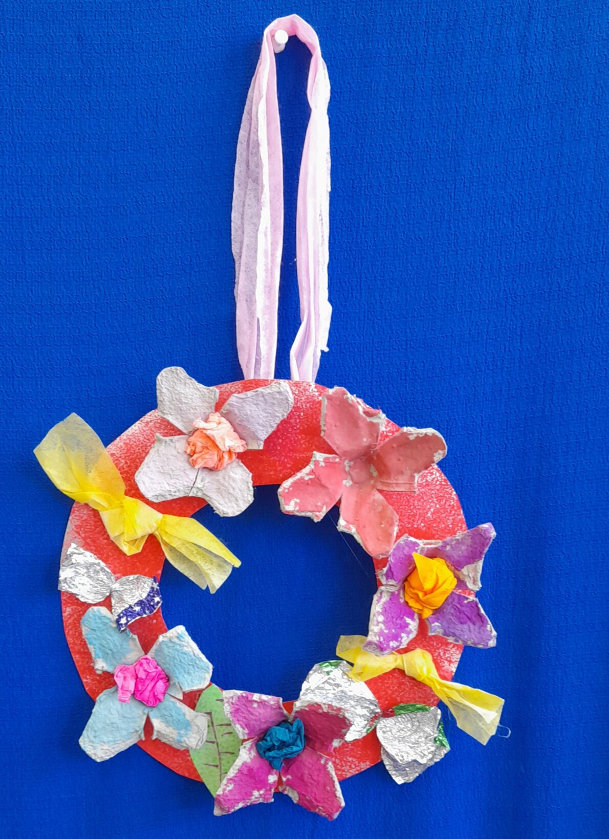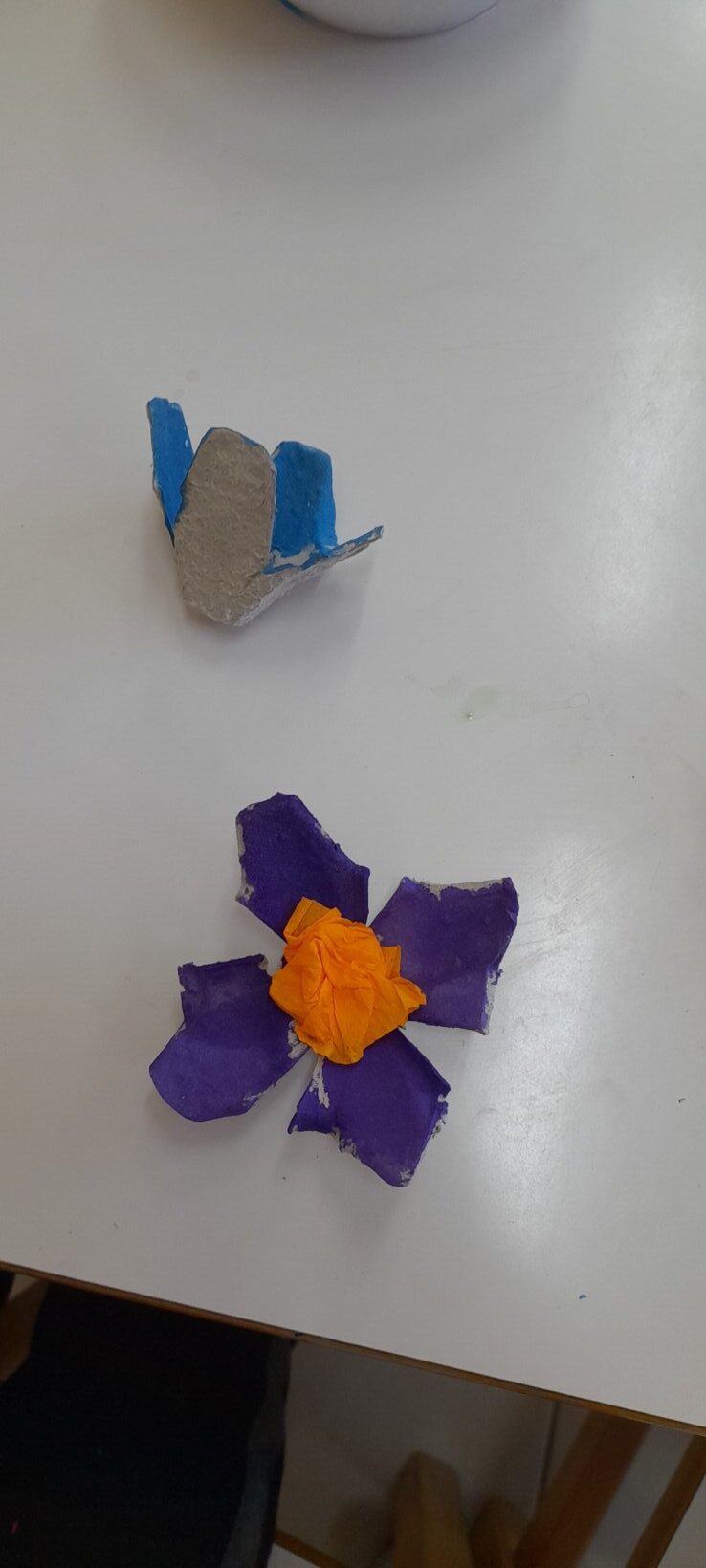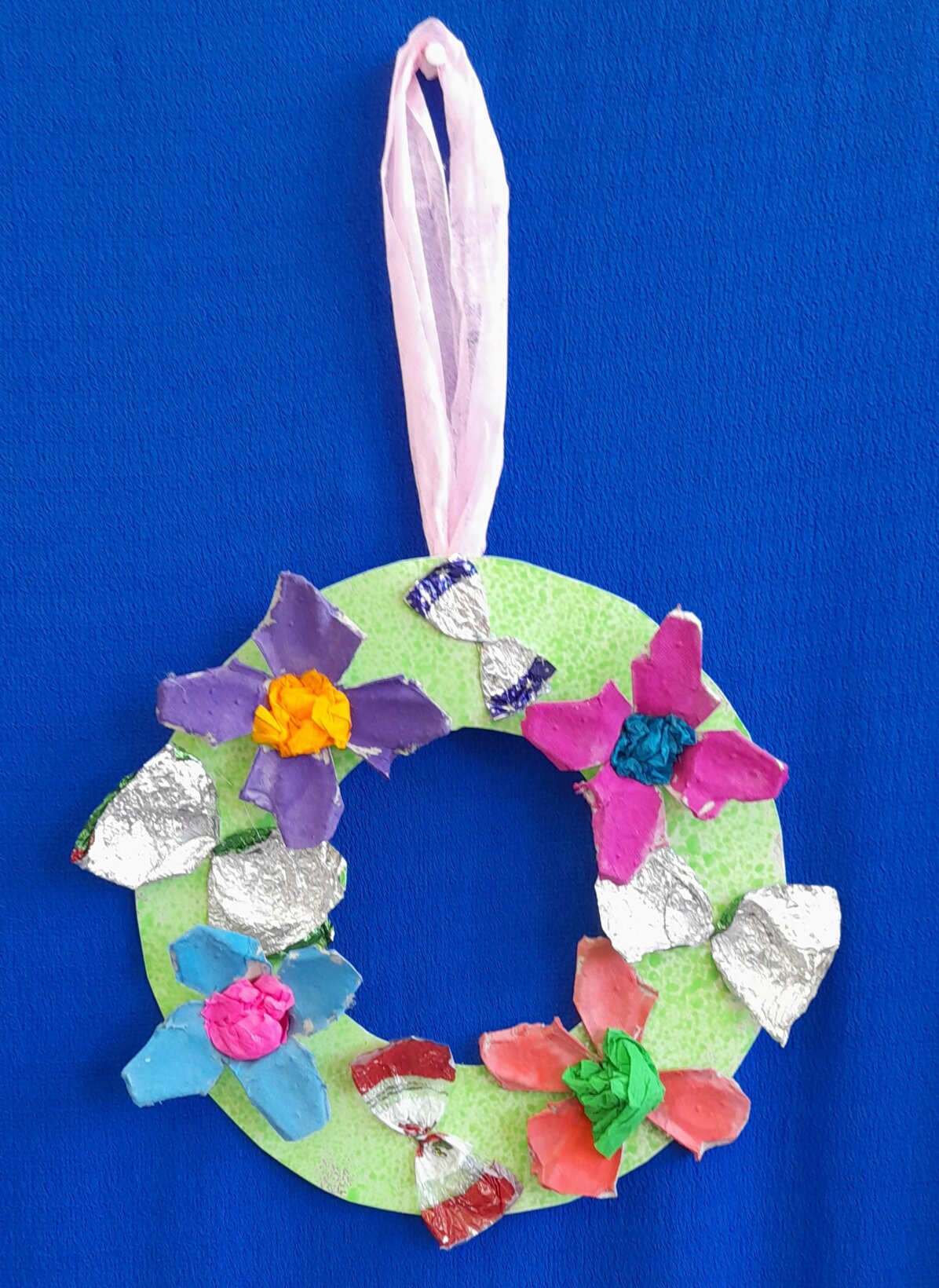 Τα παιδιά υποδέχθηκαν το Μάη …λίγο νωρίτερα , φτιάχνοντας πρωτομαγιάτικα στεφάνια από ανακυκλώσιμα υλικά . Το στεφάνι από τυπώματα με σφουγγάρι και τα λουλούδια από χάρτινες αβγοθήκες βαμμένες με τέμπερες . Συμπλήρωσαν τη σύνθεση πεταλούδες , από καραμελόχαρτα αφού πρώτα… καταναλώθηκε το περιεχόμενό τους!!!