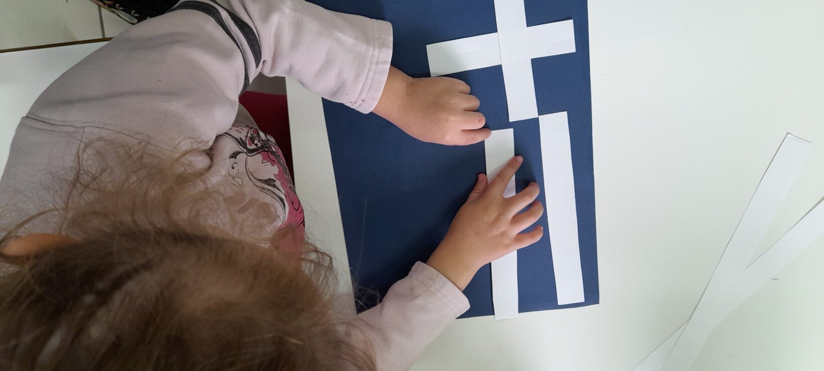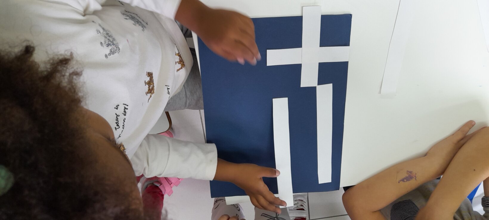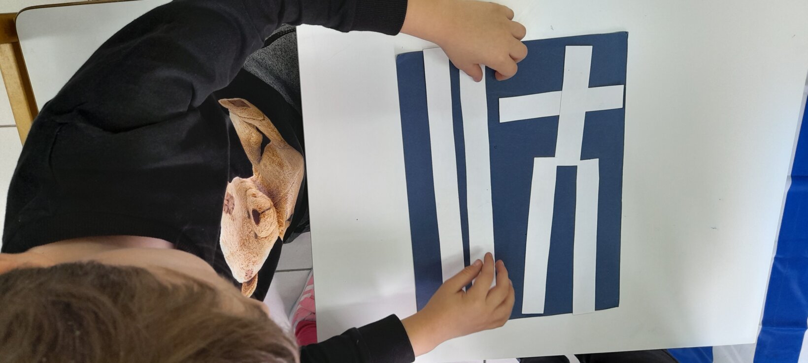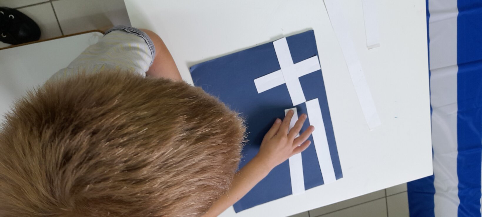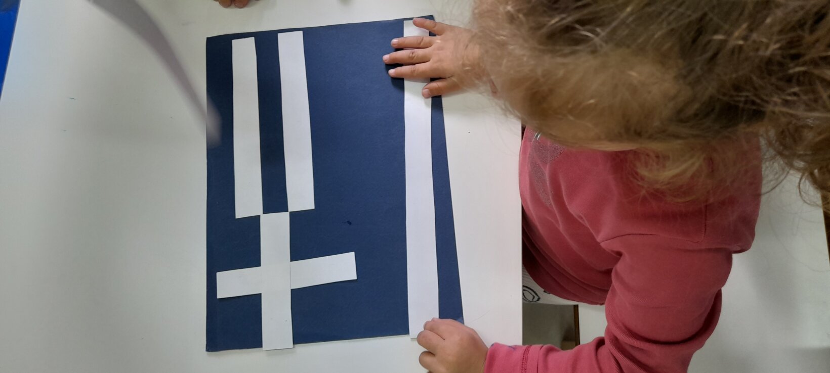 Οι Νεράιδες σύμφωνα με το παραμύθι αποφάσισαν για τα χρώματα και τα σχήματα της ελληνικής σημαίας .Τα παιδιά την παρατηρούν…τη συναρμολογούν ….