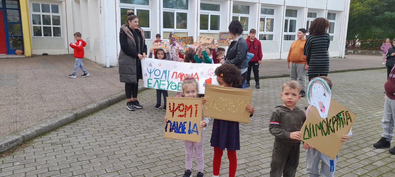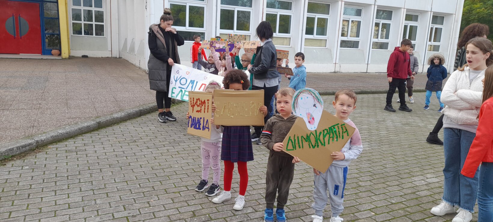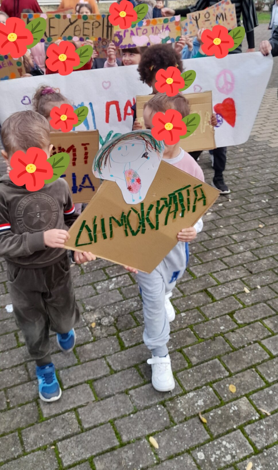 Στις 17 Νοέμβρη , η αυλή του σχολείου μας γέμισε μικρούς διαδηλωτές!!! Τα νήπια των νηπιαγωγείων Δένδρων και Πλατανουλίων , θέλοντας να τιμήσουν τους ήρωες του Πολυτεχνείου , έστησαν τη δική τους διαδήλωση , φωνάζοντας συνθήματα όπως τότε…για ΕΛΕΥΘΕΡΙΑ , ΔΗΜΟΚΡΑΤΙΑ , ΙΣΟΤΗΤΑ . Η διαδήλωση μεγάλωνε καθώς προστέθηκαν και παιδιά του Δημοτικού σχολείου.