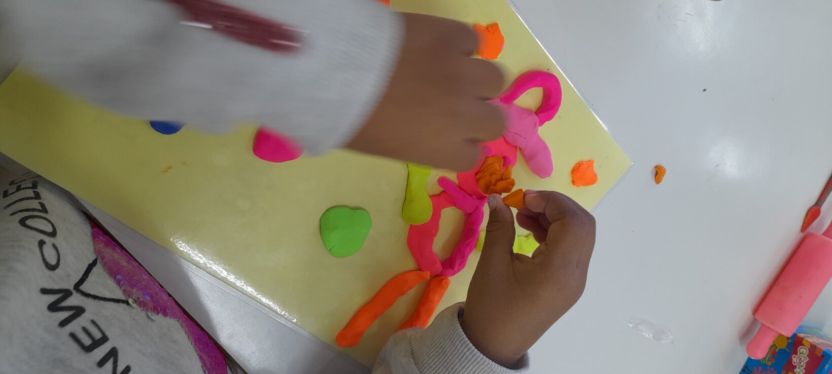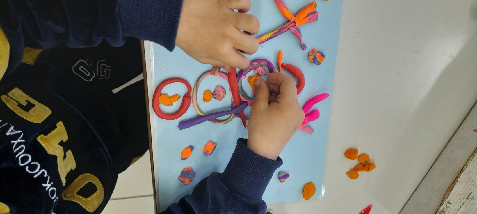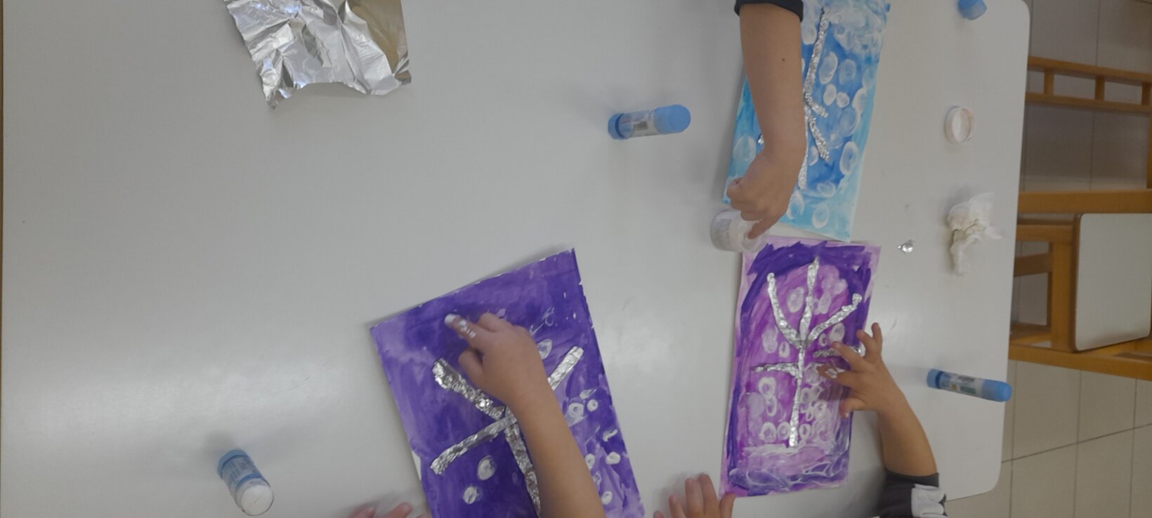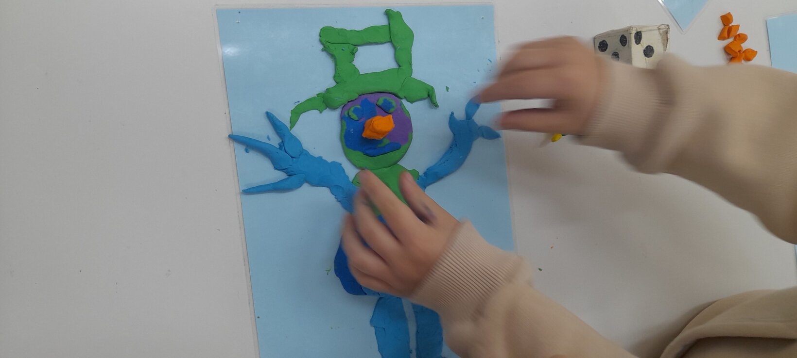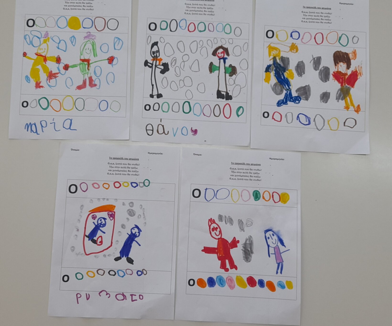 Tο ίδιο παιχνίδι το συνεχίζουν σε ζευγάρια , αφού πρώτα φτιάξουν με πλαστελίνη το ένα παιδί το σπουργίτι και το άλλο , το χιονάνθρωπο.