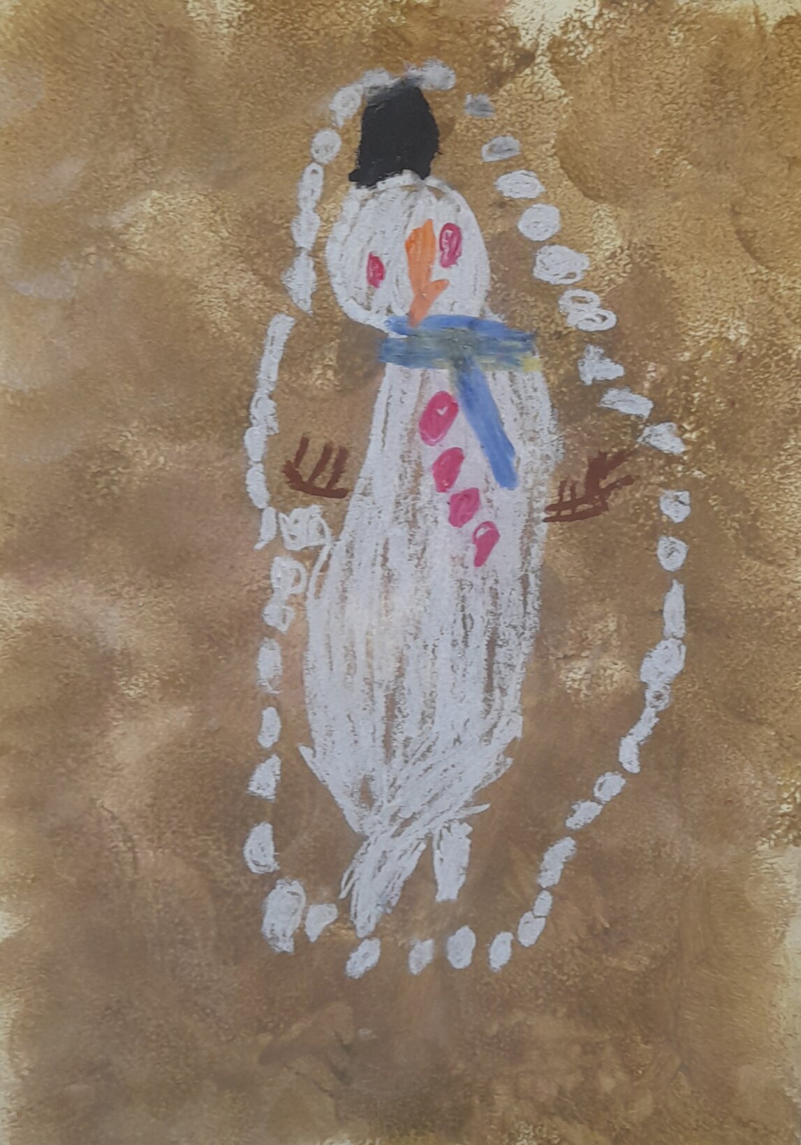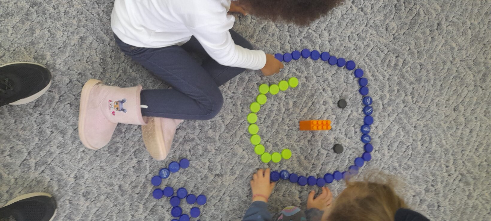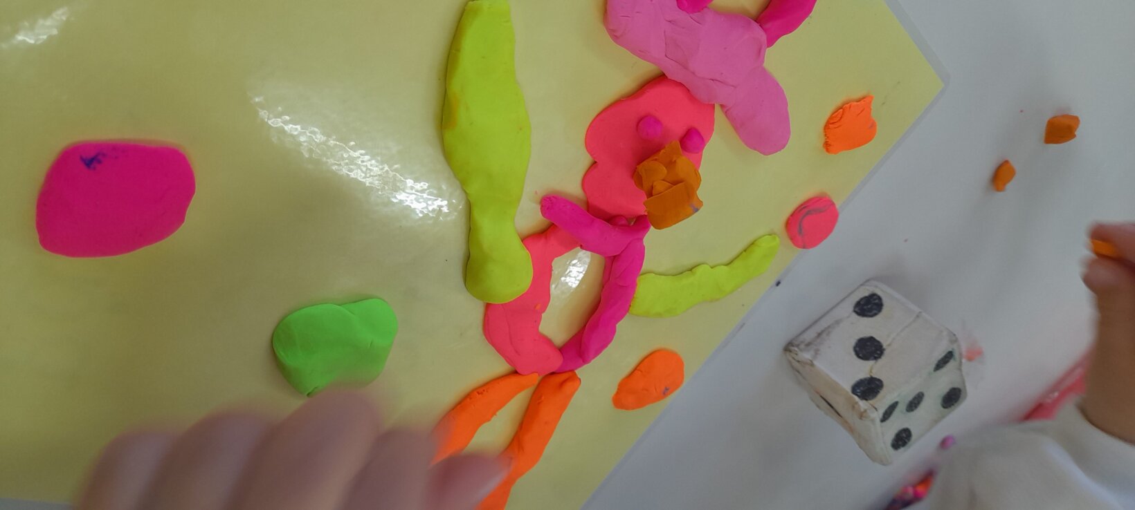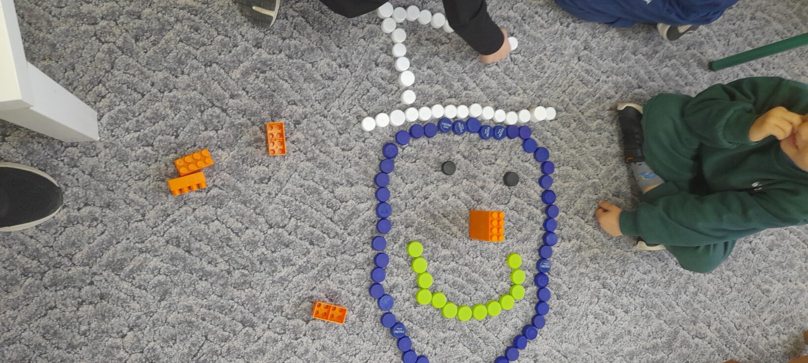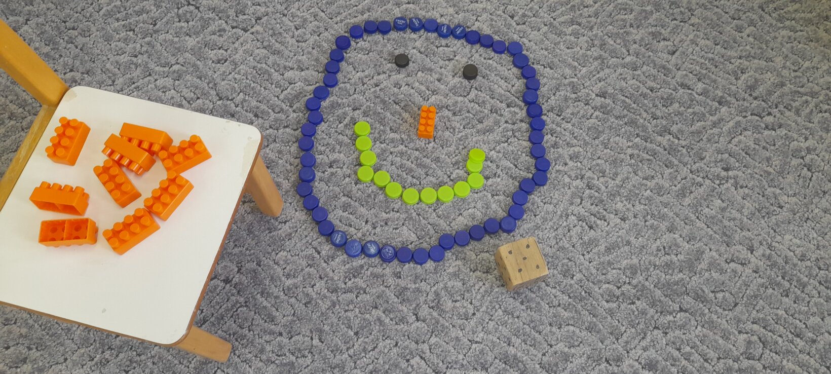 Τα παιδιά σχεδιάζουν με καπάκια από μπουκάλια το πρόσωπο ενός χιονάνθρωπου. Εκ περιτροπής ρίχνουν το ζάρι ‘ αναγνωρίζουν την ποσότητα και βάζουν στον χιονάνθρωπο τόσα καρότα όσα δείχνει το ζάρι.