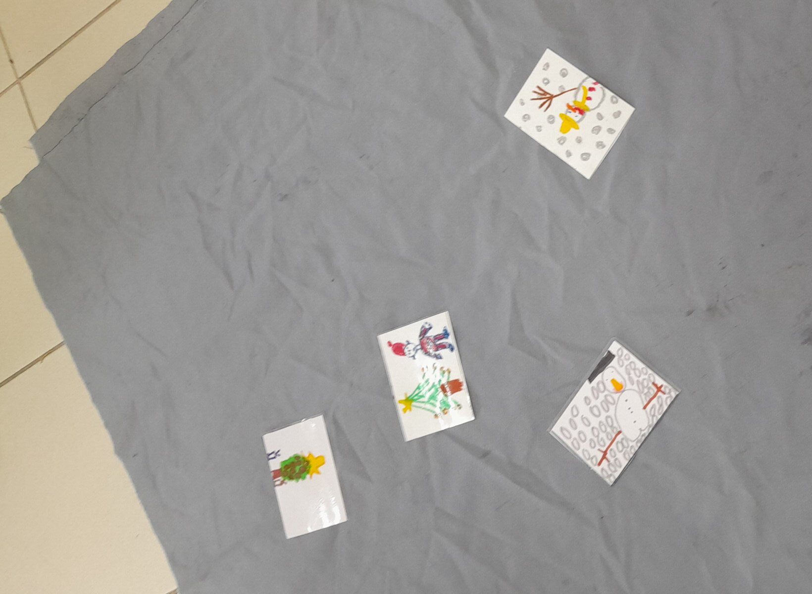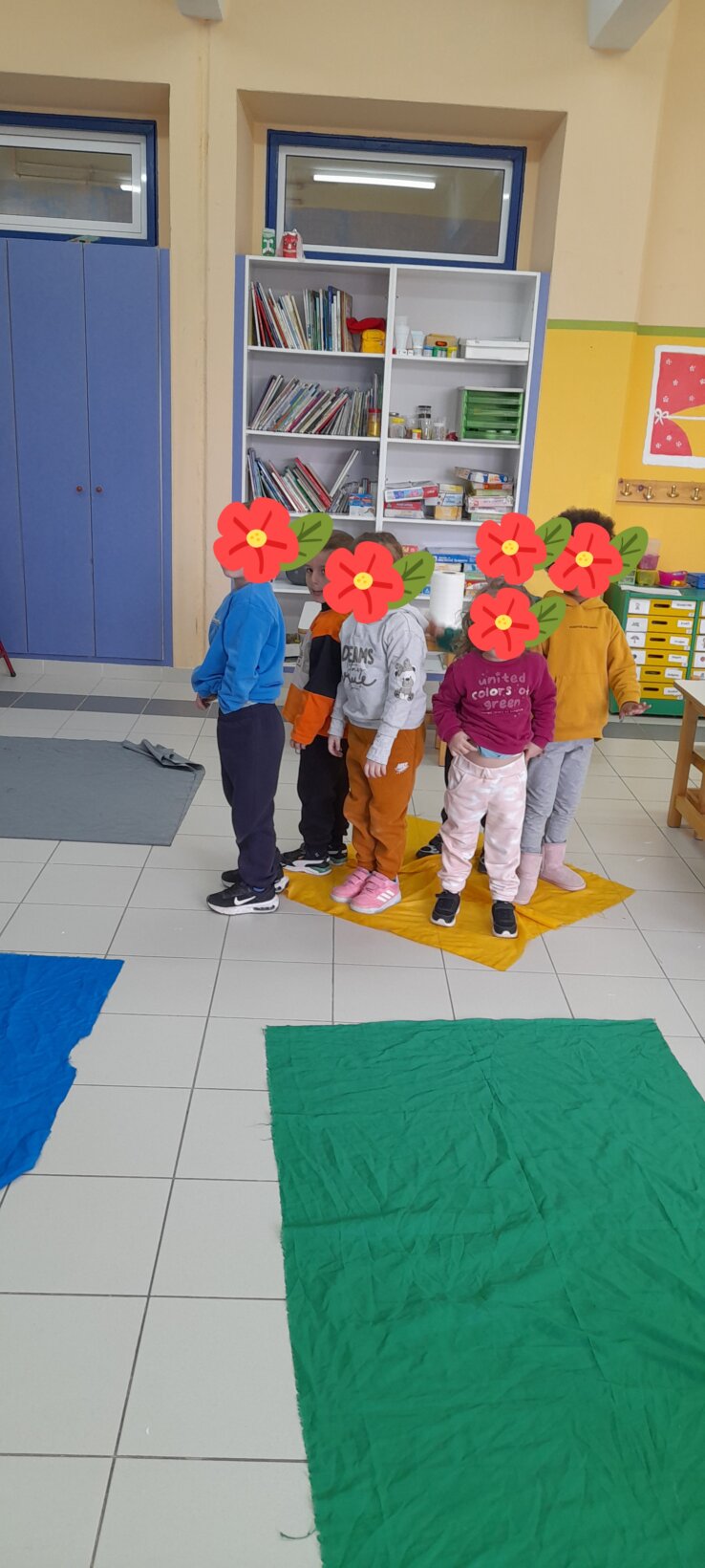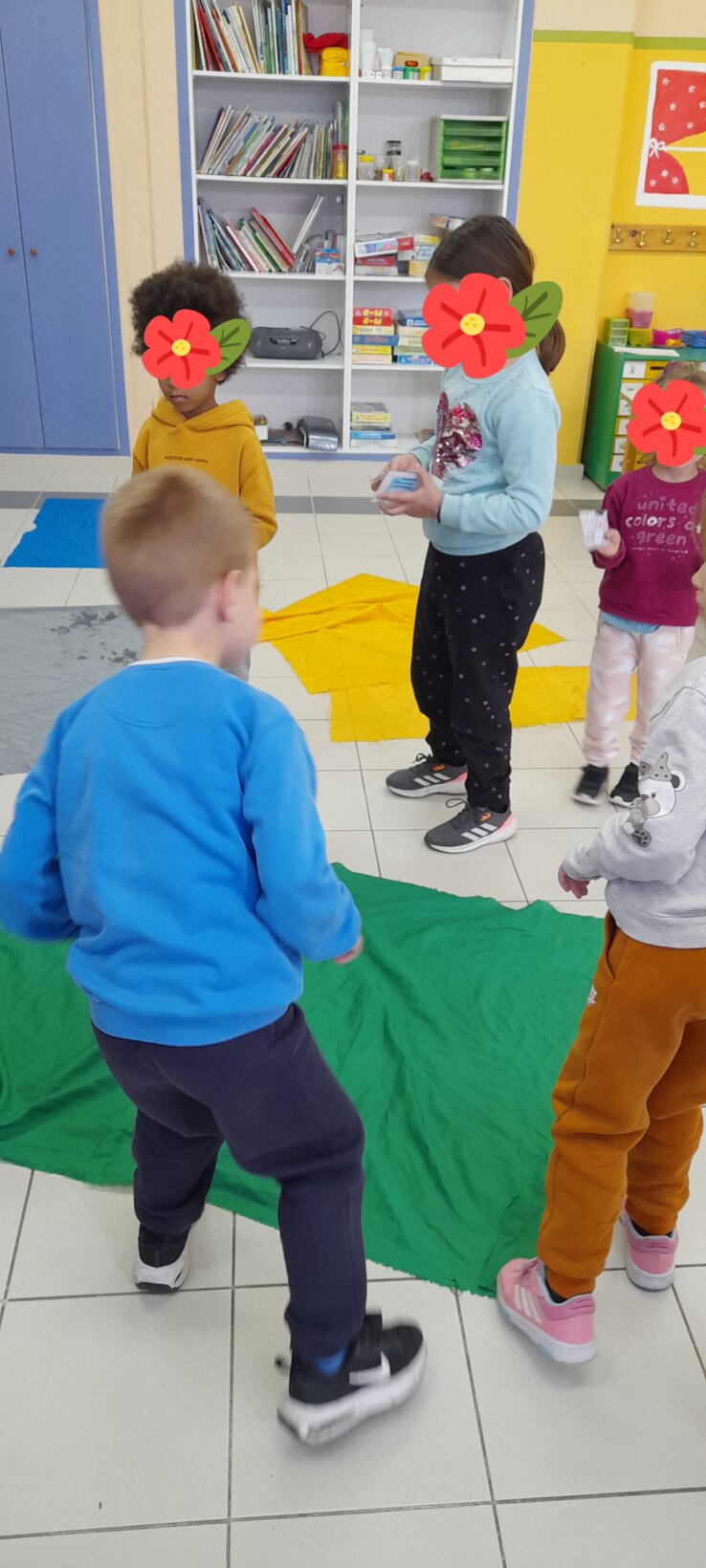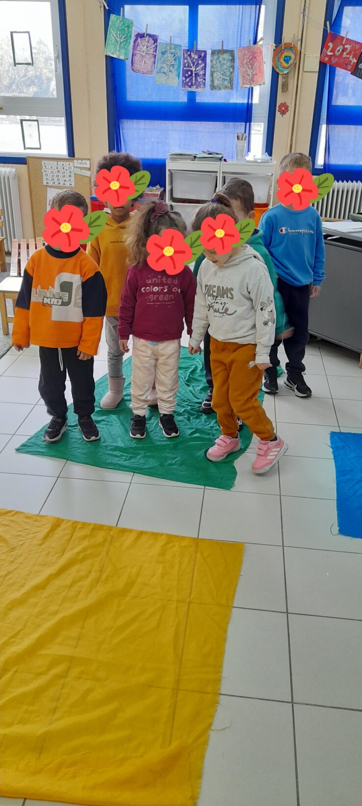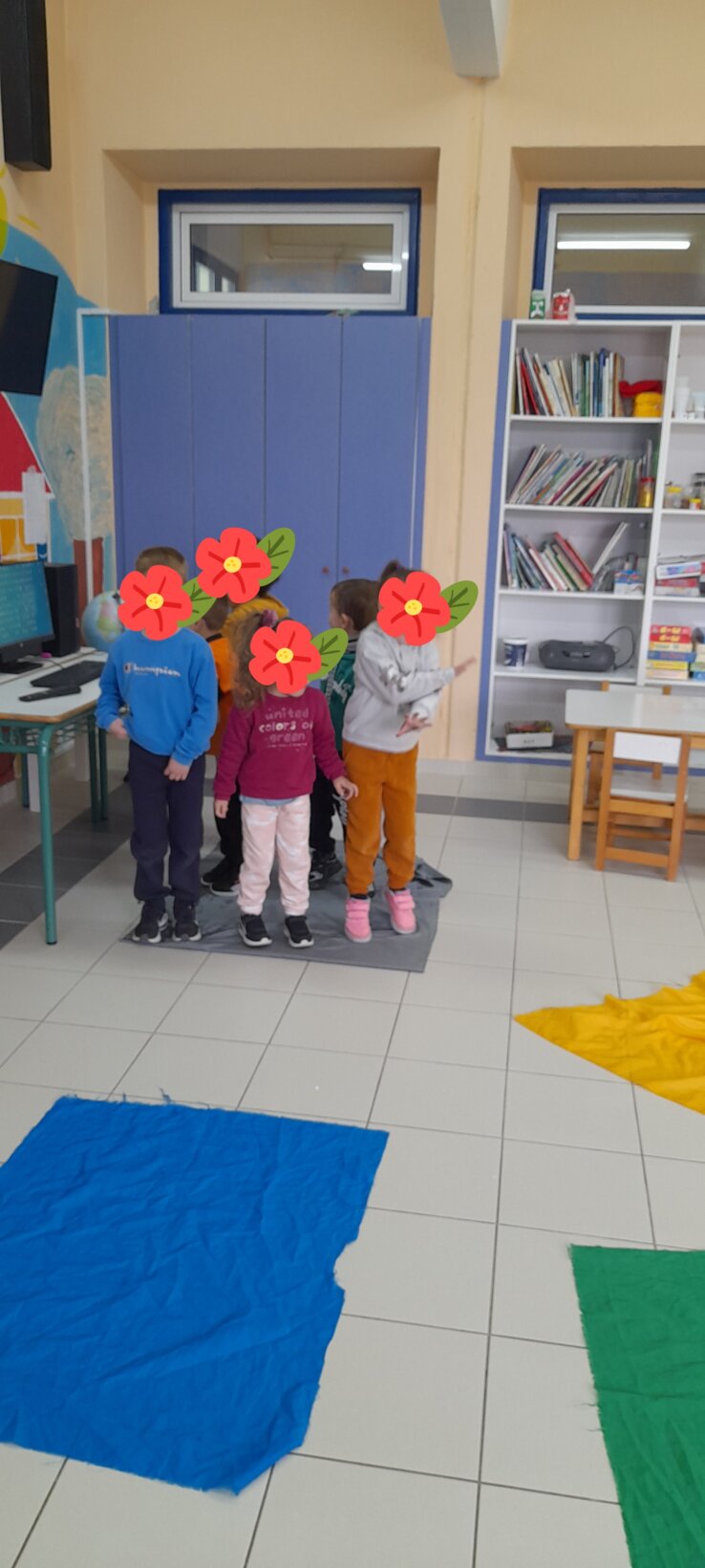Στη συνέχεια κρατώντας την αίσθηση που τους άφησε , περπάτησαν ανάμεσα από τα 4 πανιά που ήταν απλωμένα στο πάτωμα .Τα διαφορετικά χρώματα ( κίτρινο , γκρι , πράσινο , γαλάζιο ) τους θύμισε τις 4 εποχές και η περιπέτεια ξεκίνησε….