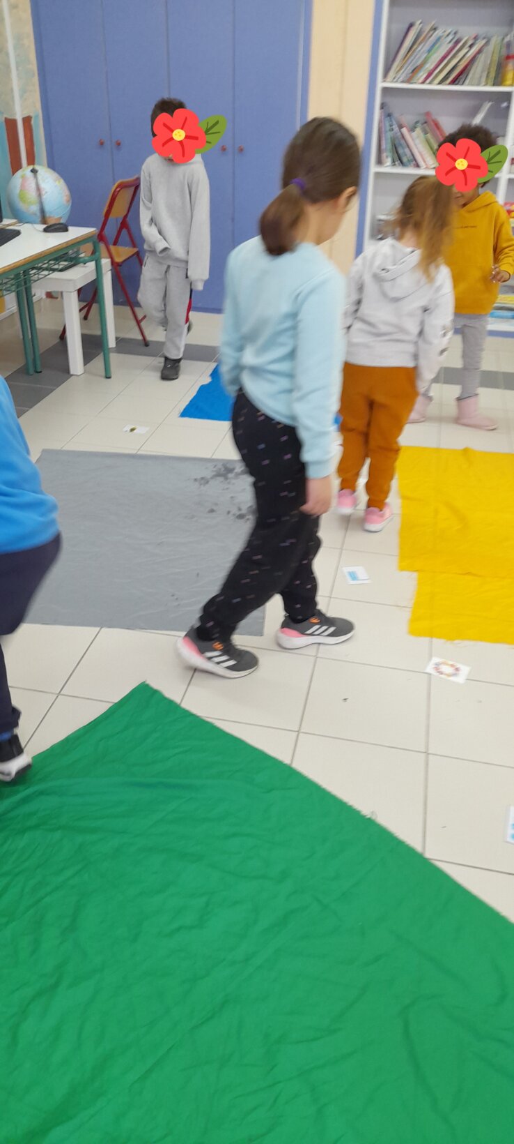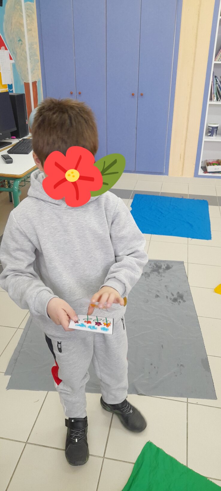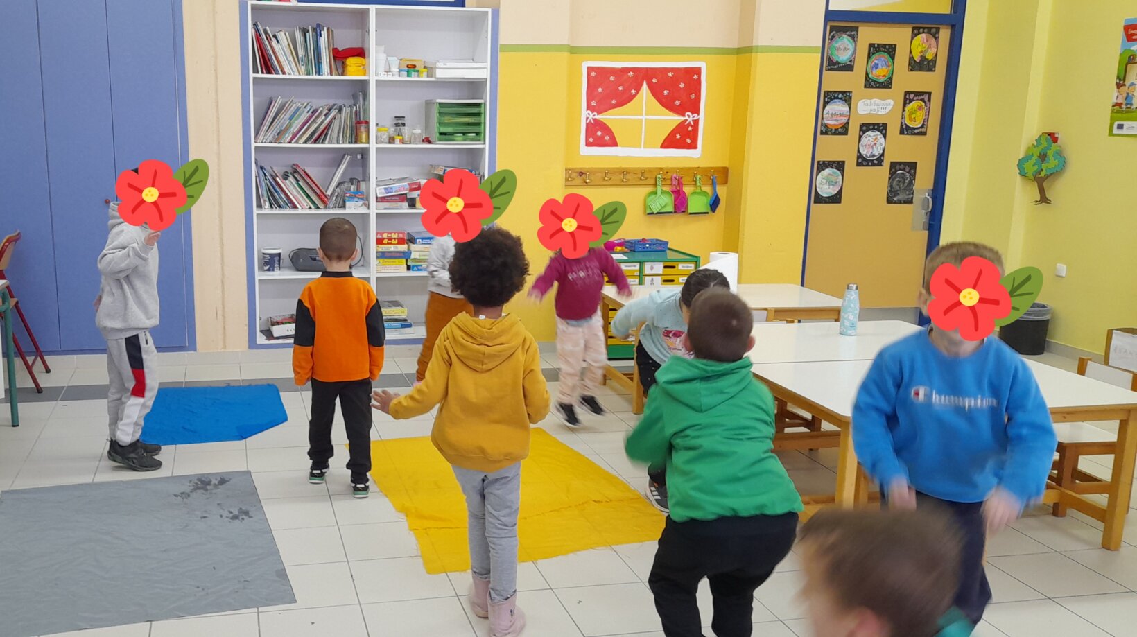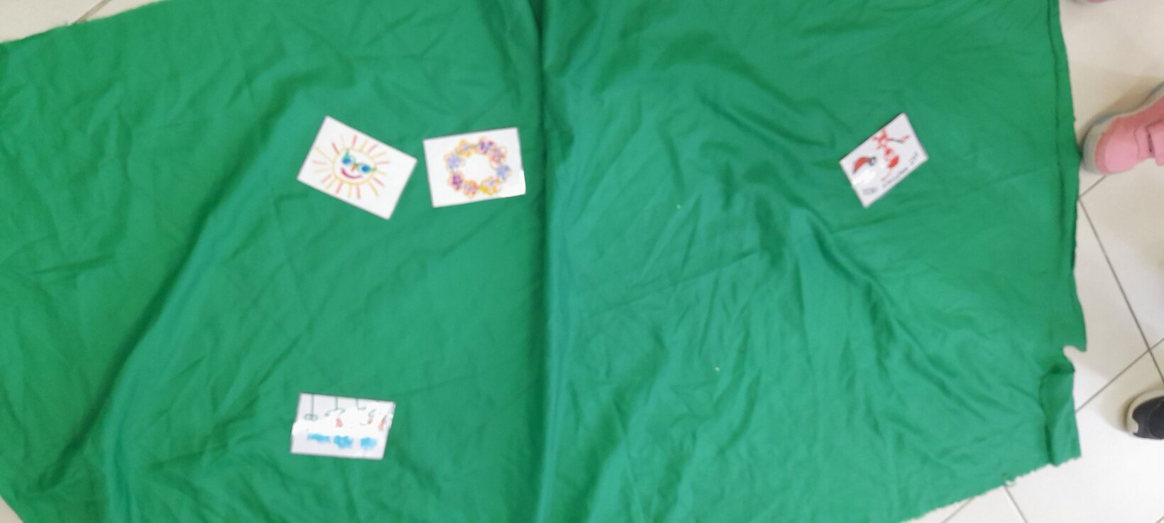 Στη συνέχεια κρατώντας την αίσθηση που τους άφησε , περπάτησαν ανάμεσα από τα 4 πανιά που ήταν απλωμένα στο πάτωμα .Τα διαφορετικά χρώματα ( κίτρινο , γκρι , πράσινο , γαλάζιο ) τους θύμισε τις 4 εποχές και η περιπέτεια ξεκίνησε….