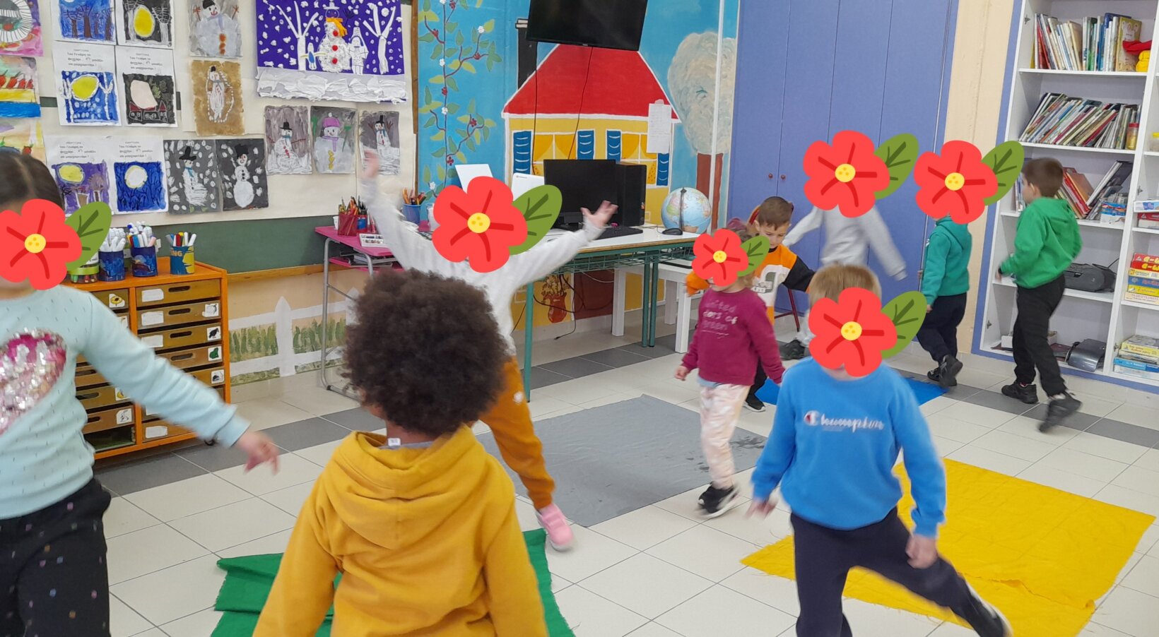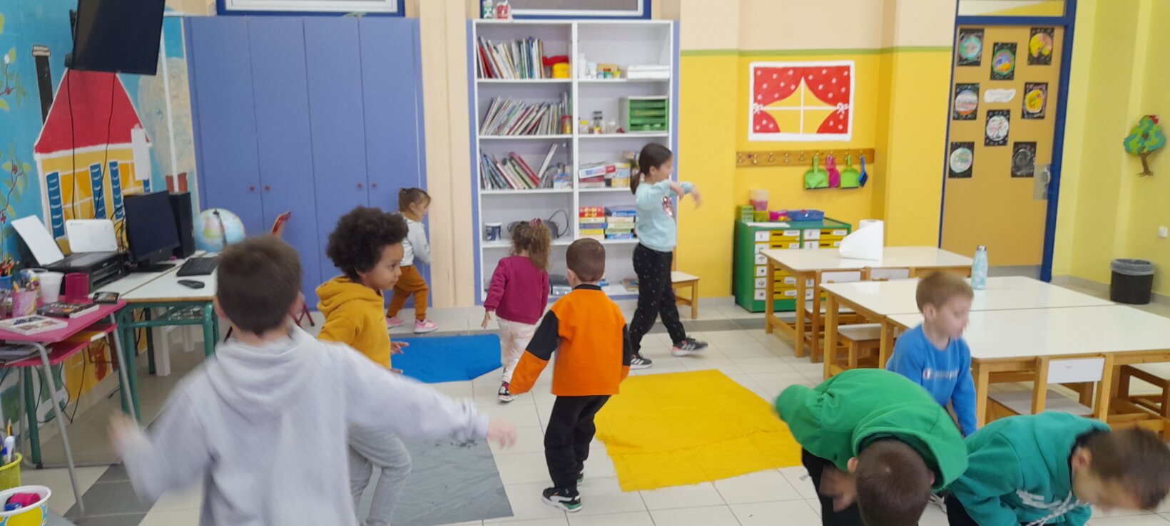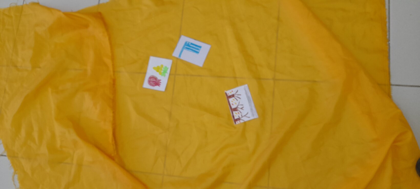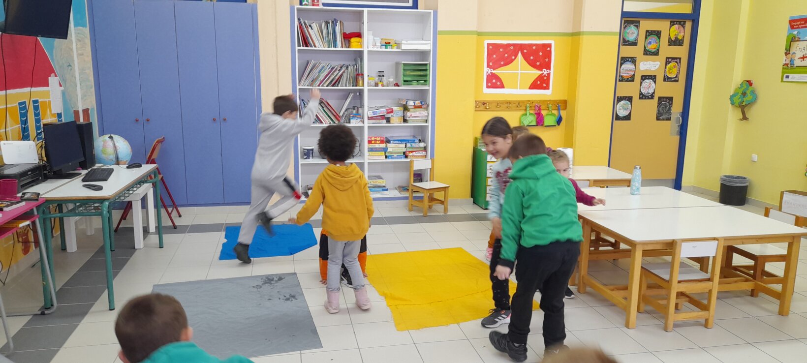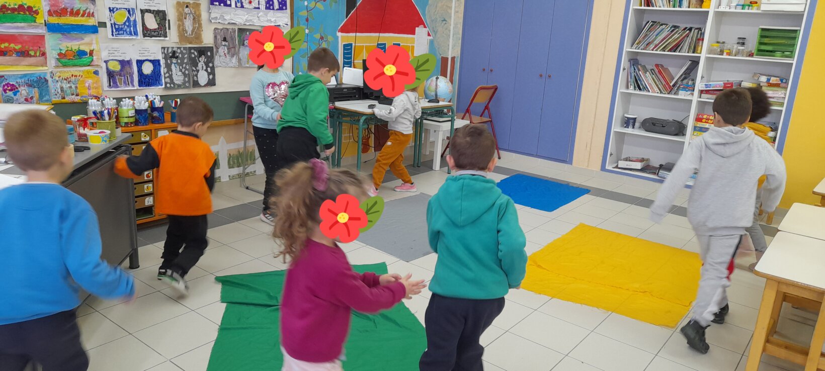 Στη συνέχεια κρατώντας την αίσθηση που τους άφησε , περπάτησαν ανάμεσα από τα 4 πανιά που ήταν απλωμένα στο πάτωμα .Τα διαφορετικά χρώματα ( κίτρινο , γκρι , πράσινο , γαλάζιο ) τους θύμισε τις 4 εποχές και η περιπέτεια ξεκίνησε….
