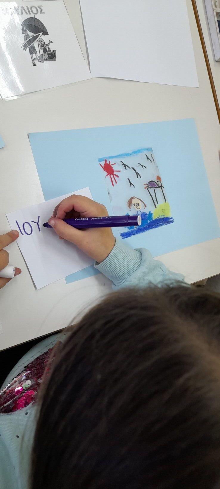 Έγιναν ομάδες .Στη συνέχεια , ανακάλυψαν πως κάτω υπήρχαν σκορπισμένες καρτέλες με τα χαρακτηριστικά της κάθε εποχής. Τις μάζεψαν και παρατηρώντας τες προσεκτικά , τις τοποθέτησαν στο σωστό πανί (εποχή)