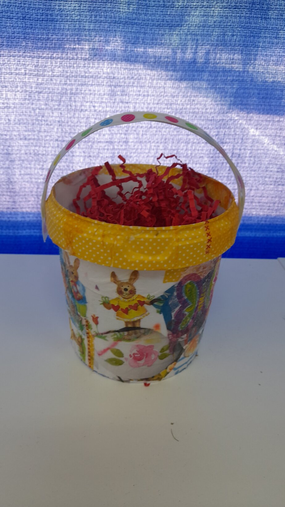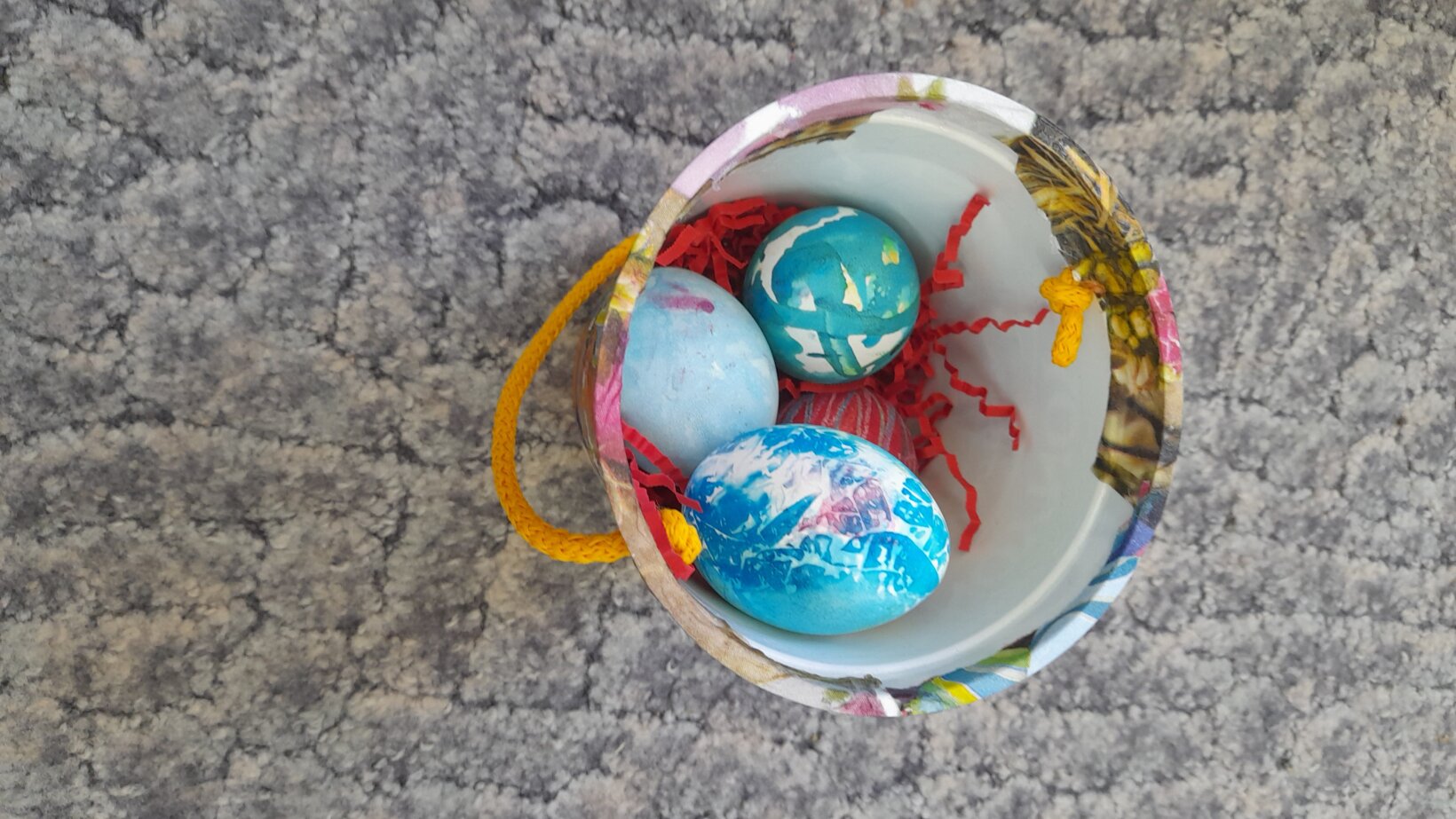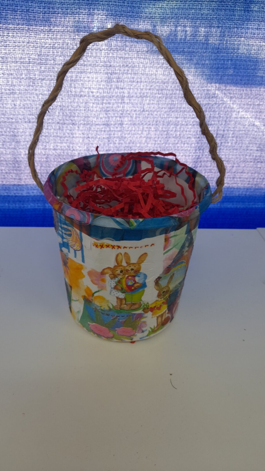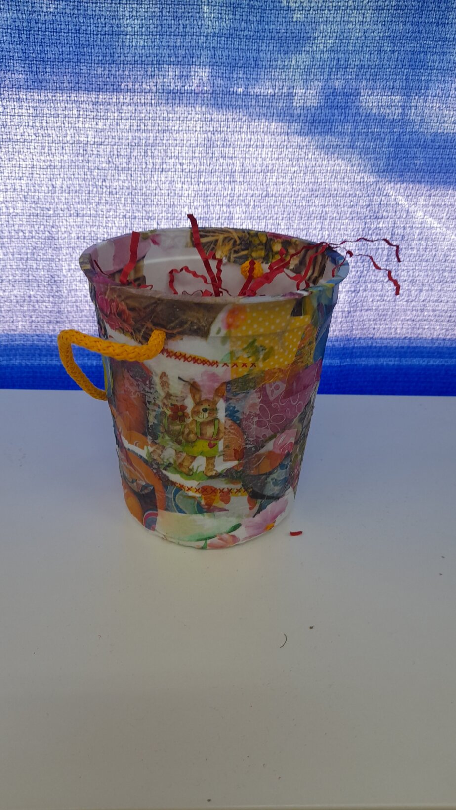 - Τα άδεια κεσεδάκια από γιαούρτι μεταμορφώθηκαν σε πασχαλινά καλαθάκια, χρησιμοποιώντας την τεχνική ντεκουπάζ με χαρτοπετσέτες.