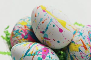 Διαλέξτε μερικά ζωντανά χρώματα, διαμορφώστε το χώρο εργασίας σας ώστε να μη λερώσετε παντού κι αρχίστε να βουτάτε το πινέλο στη μπογιά και να το τινάζετε με τα δάχτυλα, βάφοντας τ’ αυγά σας με τις πιτσιλιές.