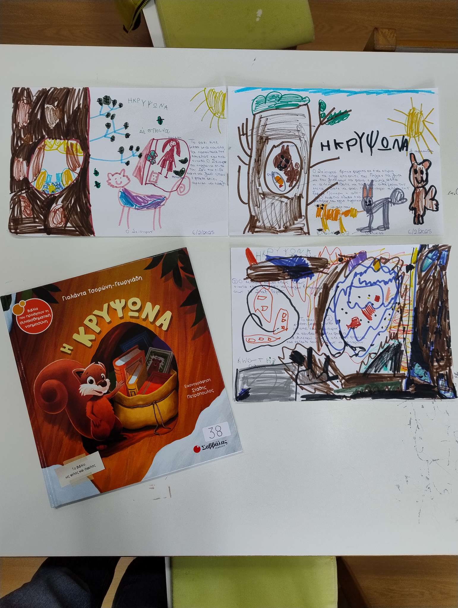 Διαβάσαμε, ακόμη, το παραμύθι “Η κρυψώνα” της Γιολάντας Τσορώνη-Γεωργιάδη (Εκδόσεις Σαββάλας), στο οποίο ένας σκίουρος, αντί να αποθηκεύει τροφή για να περάσει τον χειμώνα, αποθήκευε βιβλία. Τα παιδιά μέσα από μια σχεδιαστική δραστηριότητα έδωσαν την απάντηση στο ερώτημα “Κι αν ο σκίουρος στον σάκο του δεν κουβαλούσε βιβλία, τι άλλο θα μπορούσε να βάζει μέσα;”.