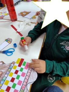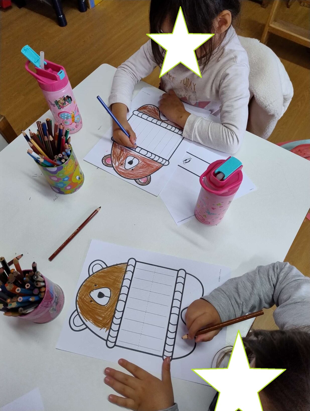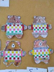 Μάλιστα, αποφασίσαμε να πλέξουμε για τις αρκούδες ζεστά πουλόβερ, αναπτύσσοντας ταυτόχρονα τη λεπτή κινητικότητά μας. Μπήκαμε, έπειτα, σε ρόλο αρκούδων και αξιοποιώντας υφάσματα, φτιάξαμε τη δική μας σπηλιά, αναζητήσαμε τροφή και προστατευτήκαμε από το κρύο του χειμώνα.