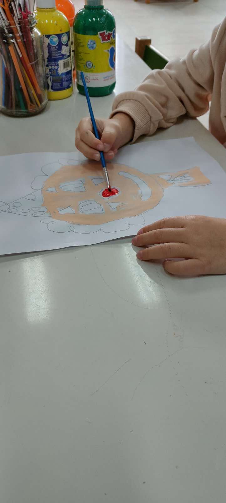 Με τη μαγική δύναμη του δαχτυλικού αποτυπώματος, τα παιδιά έφτιαξαν πολύχρωμα ψάρια. Τα κόψαμε και τα κολλήσαμε σε μπλε φόντο, δημιουργώντας το δικό μας μικρό υποθαλάσσιο κόσμο! Με αλουμινόχαρτο φτιάξαμε ματάκια που κολλήσαμε πάνω στα ψαράκια μας, δίνοντάς τους ζωή και χαρακτήρα!