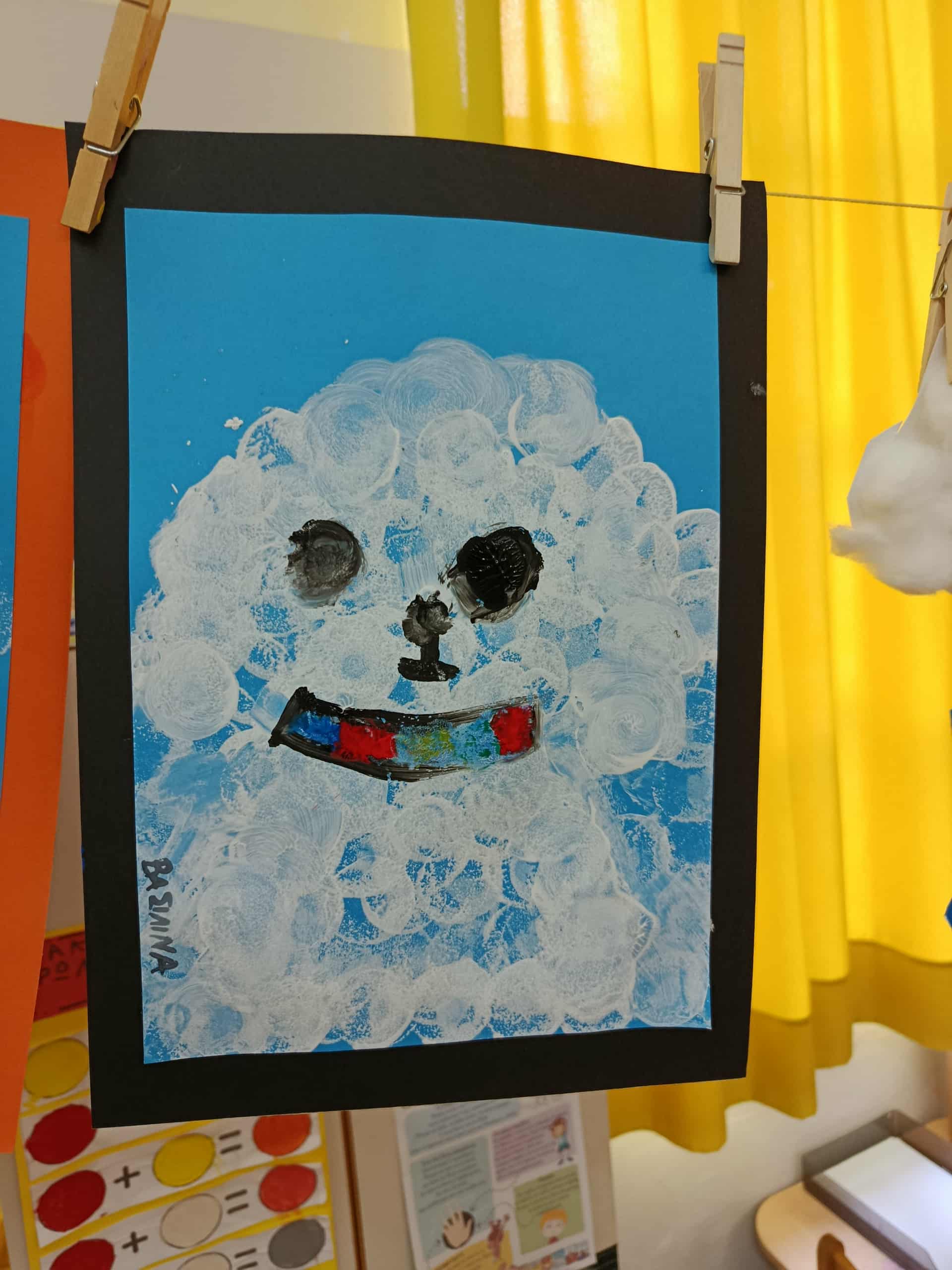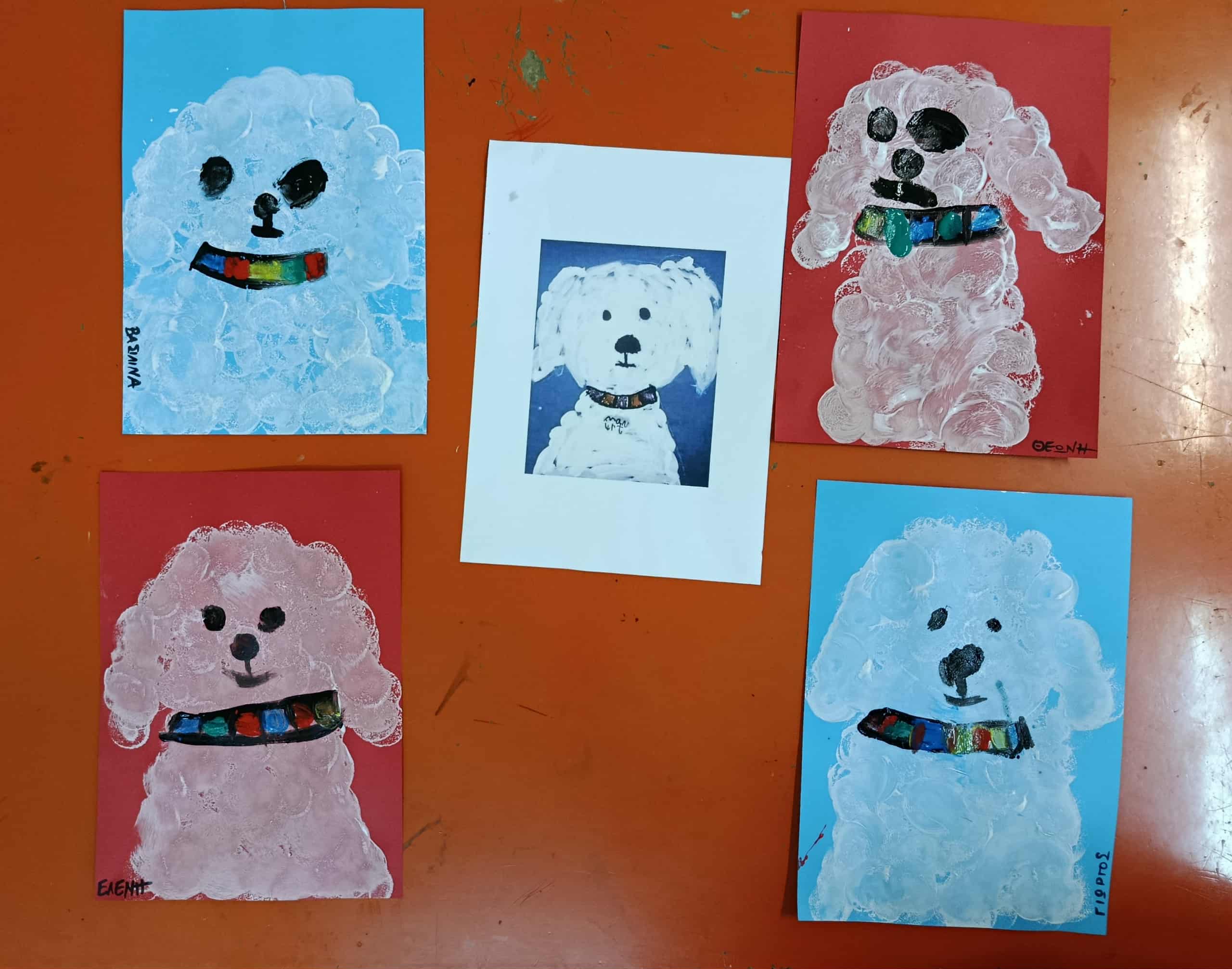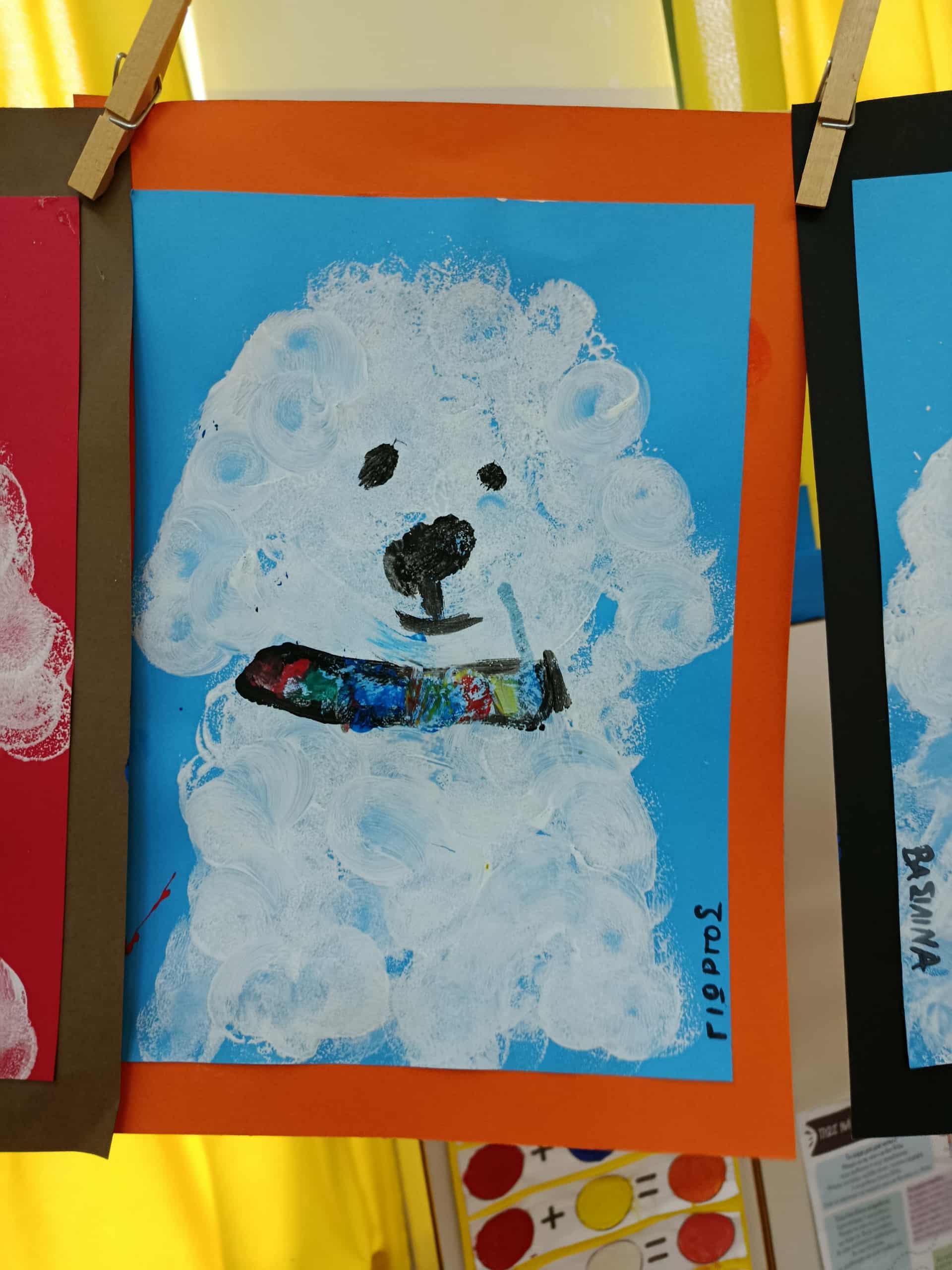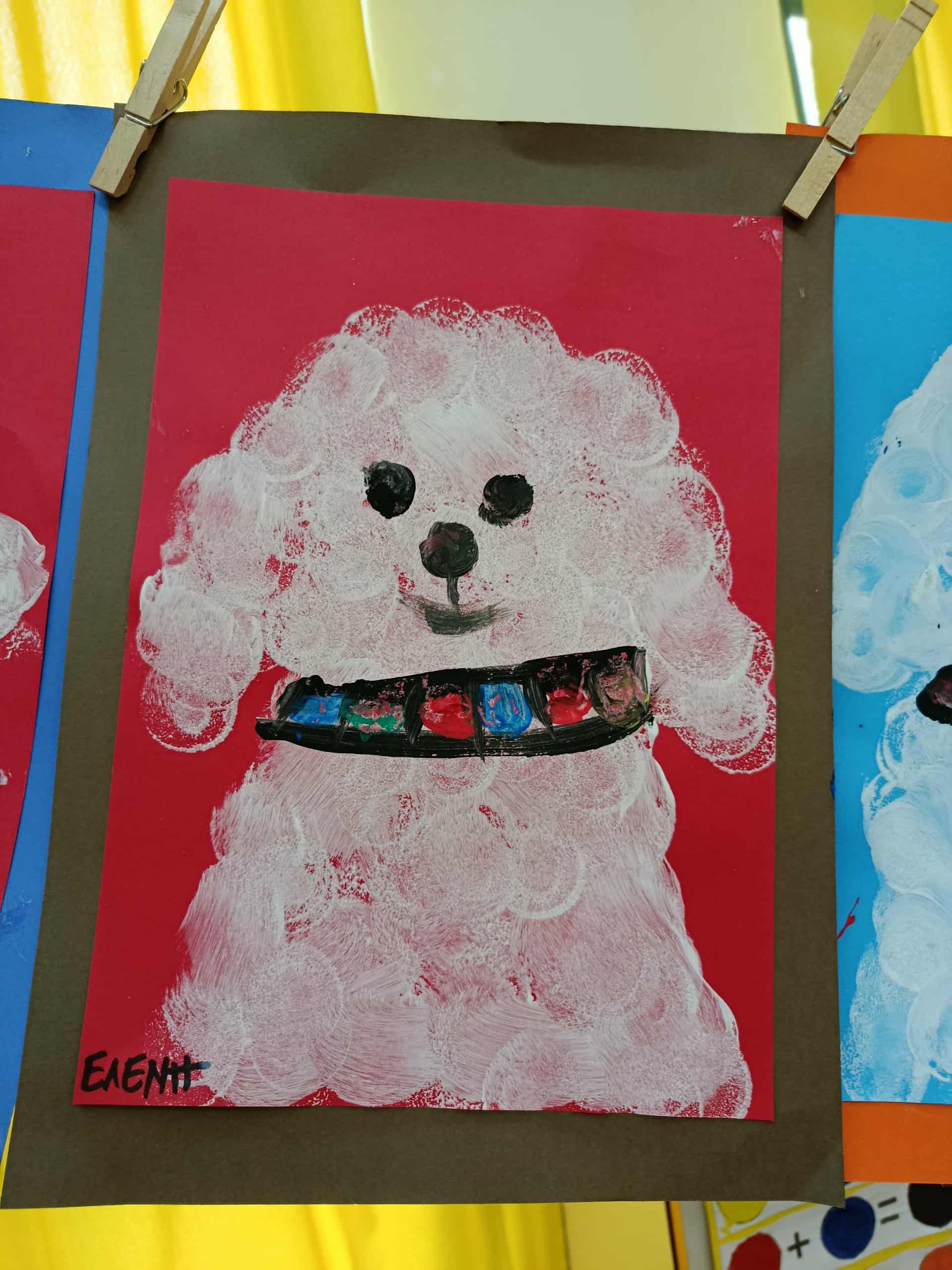Στη συνέχεια, εκφράσαμε την αγάπη μας για τους τετράποδους φίλους μας μέσω της εικαστικής αγωγής και της λεπτής κινητικότητας. Το κάθε παιδί δημιούργησε ένα μοναδικό καδράκι, όπου το σώμα ενός σκυλιού ήταν το αποτύπωμα της παλάμης του, ενώ χρωμάτισε, έκοψε και κόλλησε το κεφάλι του, εξασκώντας τον συντονισμό χεριού-ματιού. Επιπλέον, χρησιμοποιώντας την τεχνική της σφραγίδας με σφουγγαράκι και τέμπερες, ζωγραφίσαμε ένα χαρούμενο λευκό σκυλάκι με το λουράκι του.