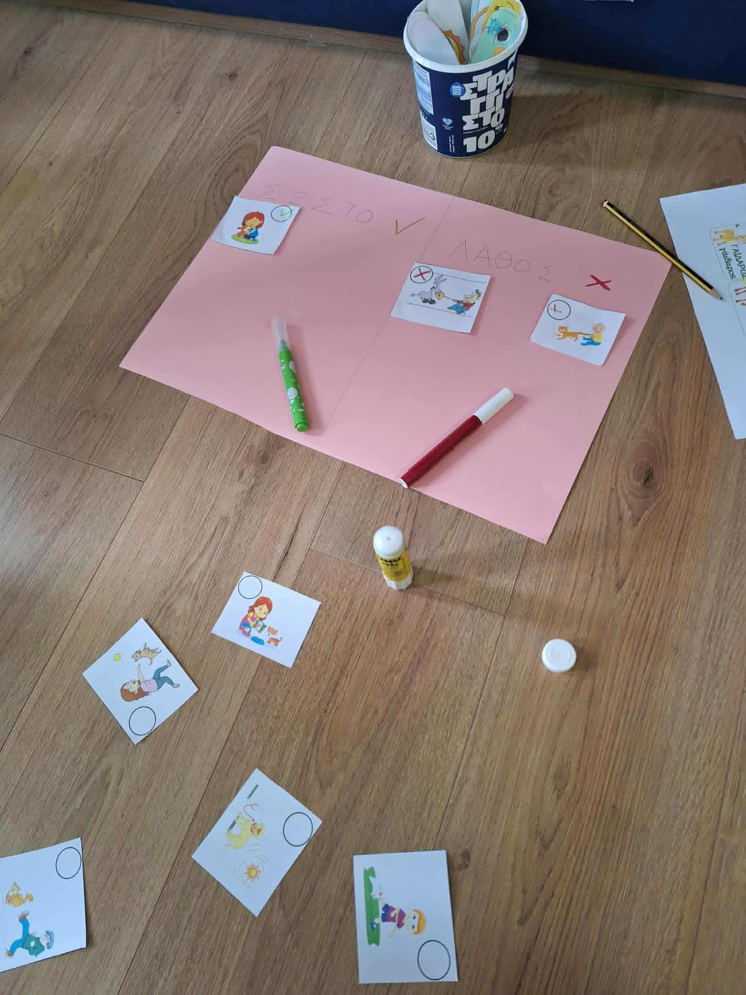 Για να ενισχύσουμε την ηθική ανάπτυξη και την κοινωνική συνείδηση των παιδιών, παίξαμε ένα ιδιαίτερο διαδραστικό παιχνίδι. Δόθηκαν στα νήπια καρτέλες και εκείνα κλήθηκαν να ταξινομήσουν εικόνες που έδειχναν παιδιά να φροντίζουν και να δείχνουν αγάπη στα ζώα, σε μία στήλη (“Σωστό”), και εικόνες παιδιών που τα πείραζαν, τα ενοχλούσαν ή τα κακομεταχειρίζονταν, σε μία άλλη (“Λάθος”), αναπτύσσοντας την κριτική σκέψη και την ικανότητα διάκρισης μεταξύ της θετικής και της αρνητικής συμπεριφοράς.