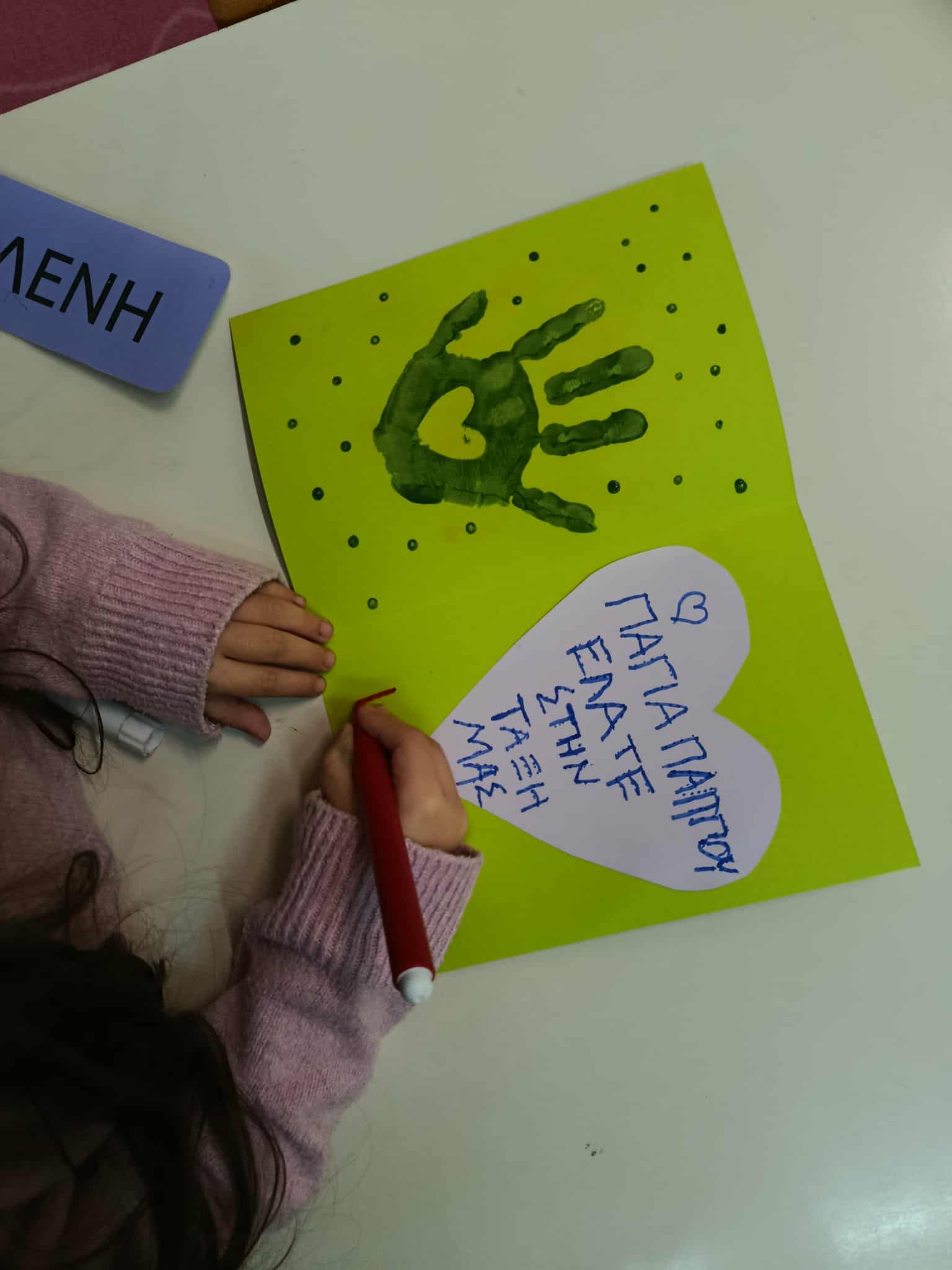 Πρόσκληση από καρδιάς: Αρχικά, τα παιδιά δημιούργησαν ατομικά, χειροποίητες προσκλήσεις οι οποίες ήταν γεμάτες με μηνύματα και αποτυπώματα αγάπης. Αυτή η δράση αποτέλεσε το πρώτο βήμα για να εκφράσουν την αγάπη και τον σεβασμό τους, επισφραγίζοντας την επίσημη εμπλοκή των παππούδων τους.