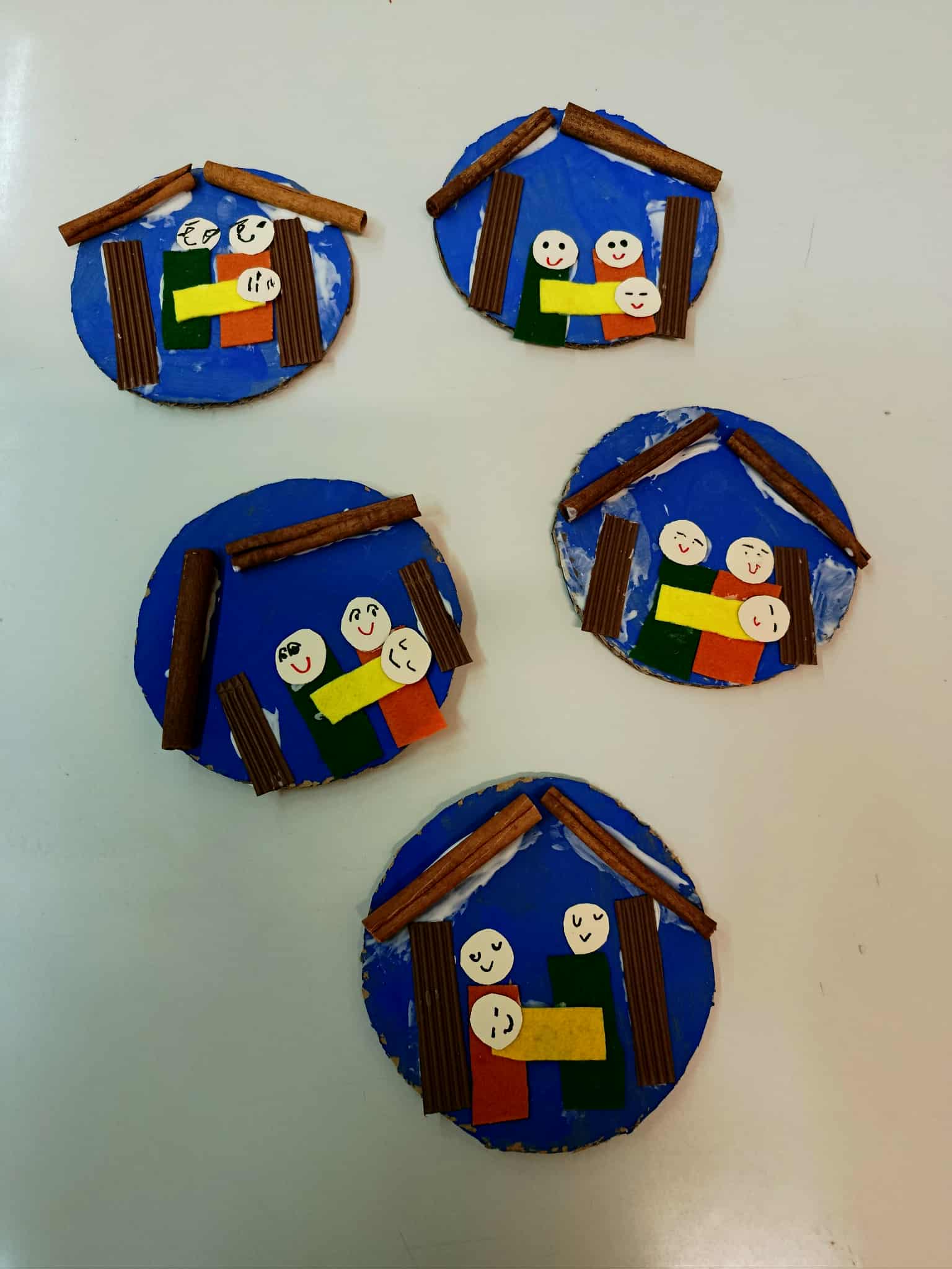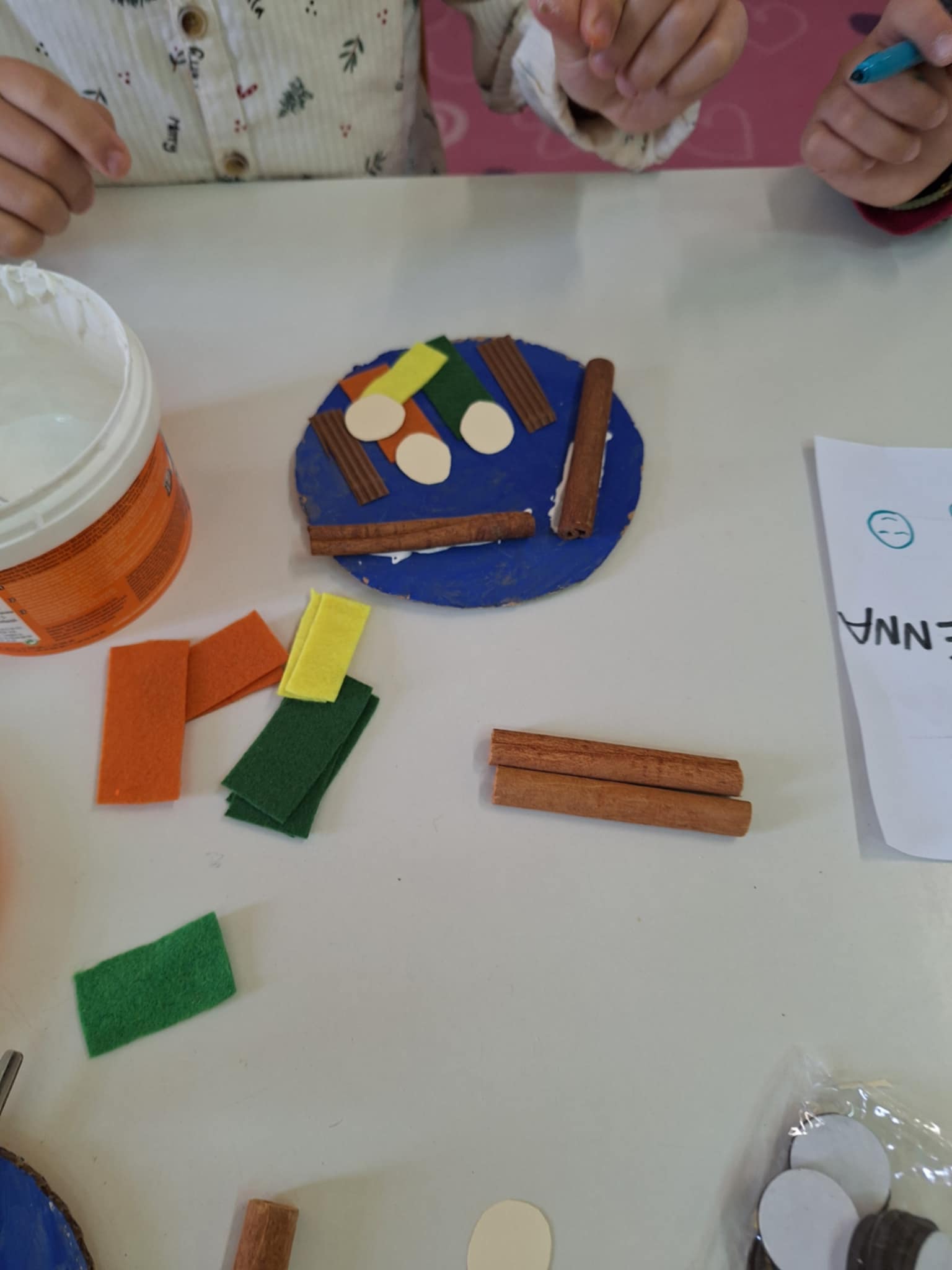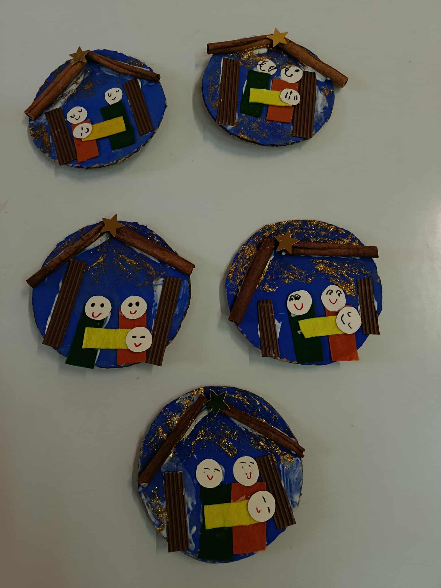 Αμέσως μετά, έδωσαν ζωή στην ιστορία, κατασκευάζοντας τη Φάτνη τους πάνω σε στρογγυλό χαρτόνι. Για να δώσουν ζεστασιά και άρωμα Χριστουγέννων, χρησιμοποίησαν δύο ξύλα κανέλας για τη σκεπή της, ενώ οι φιγούρες του νεογέννητου Χριστού, της Παναγίας και του Ιωσήφ φτιάχτηκαν από τσόχα. Φυσικά, από την κατασκευή δεν έλειπε το φωτεινό αστέρι. Η κατασκευή της Φάτνης ολοκληρώθηκε με την προσθήκη μαγνήτη στο πίσω μέρος, μετατρέποντάς την σε ένα αναμνηστικό στολίδι π.χ. ψυγείου.