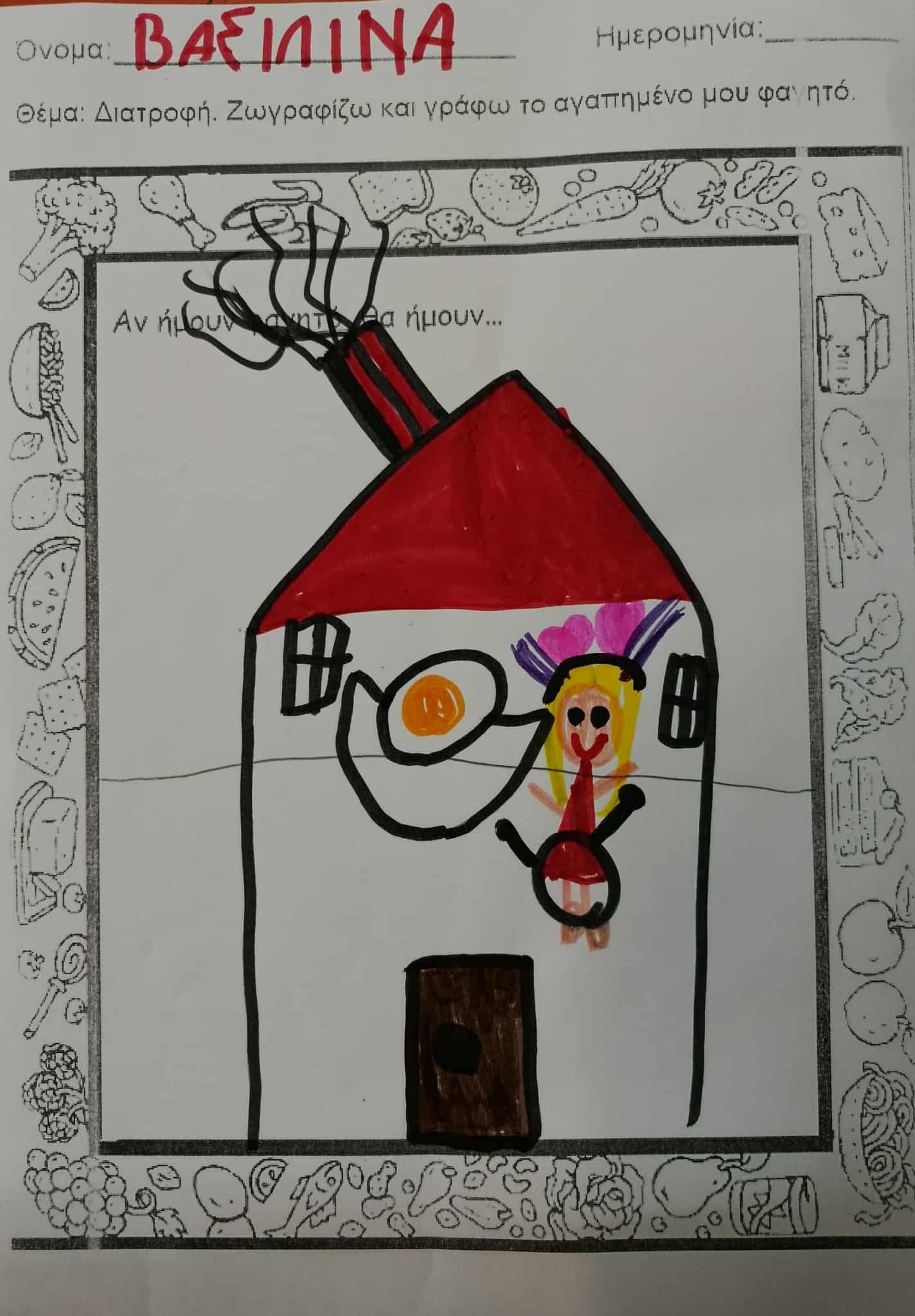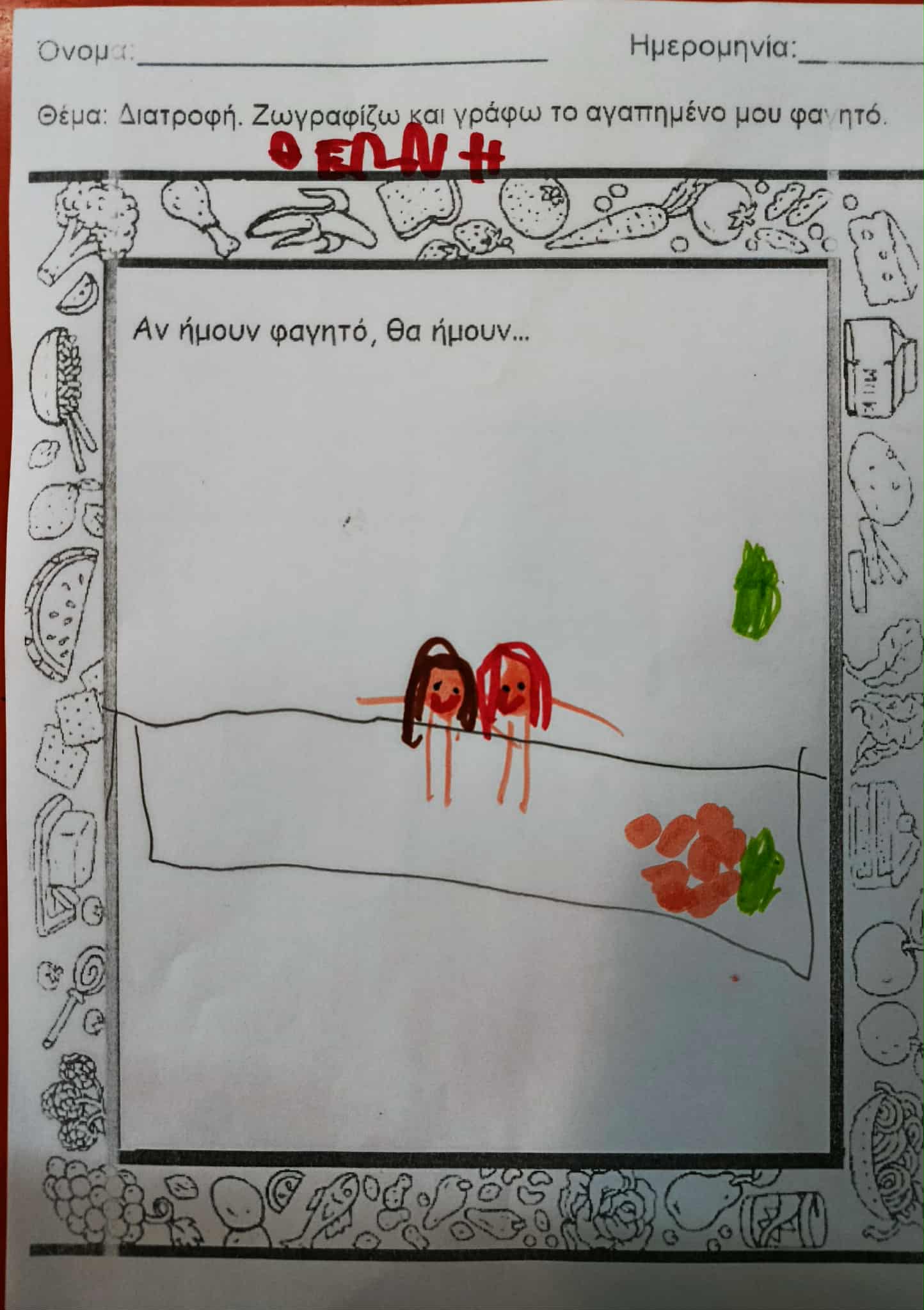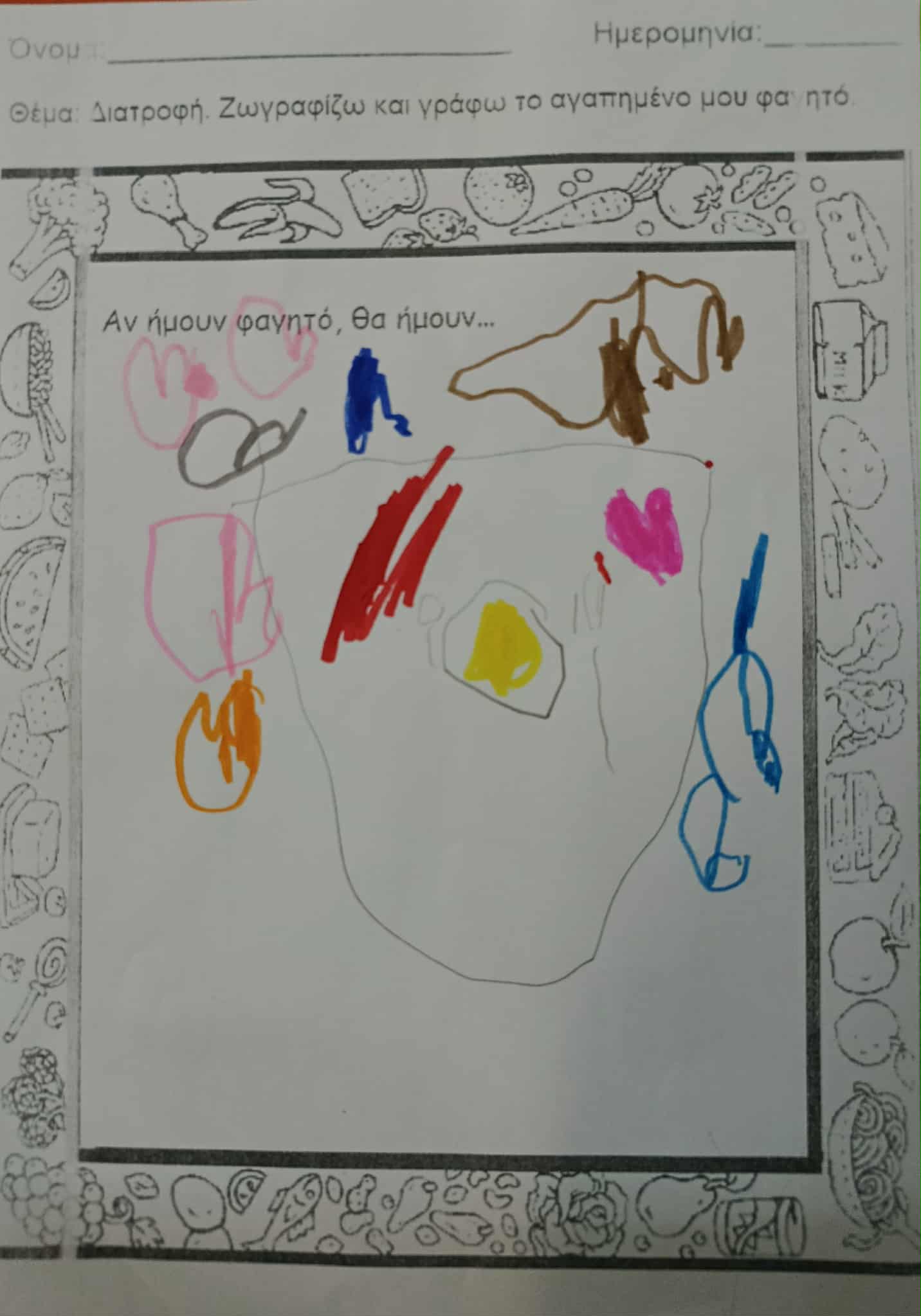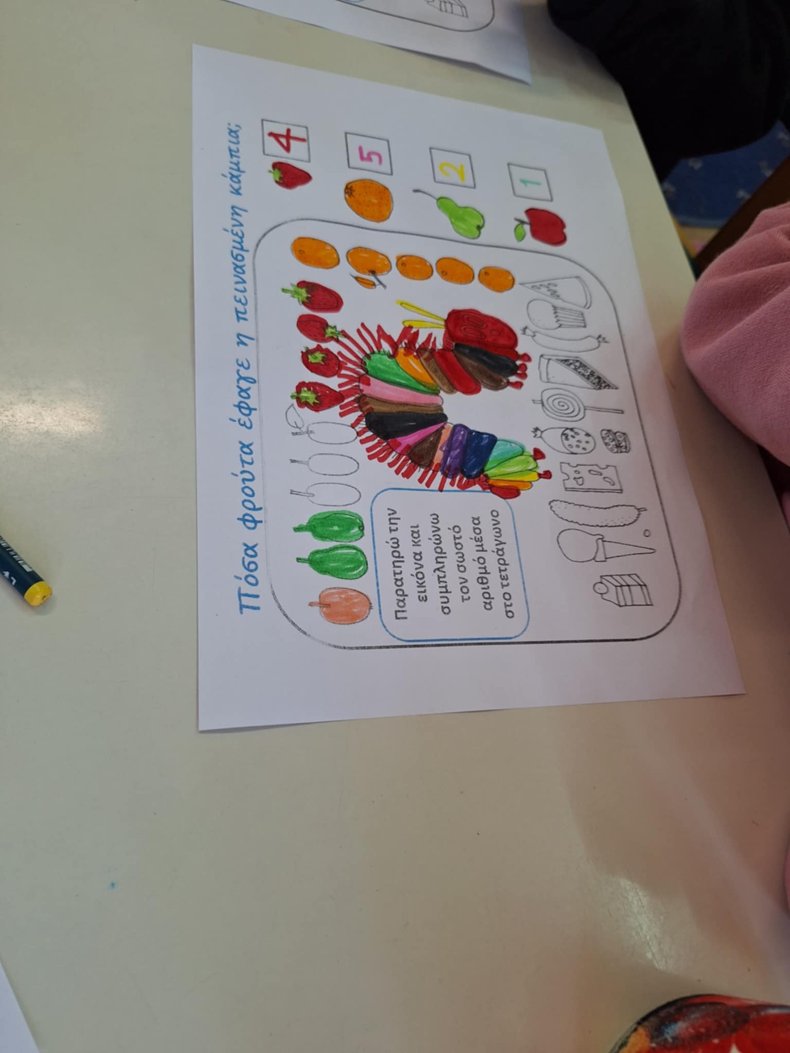 Στο πλαίσιο του προγράμματος «Τροφή για Δράση», οι μαθητές μας εξοικειώθηκαν με τη δομή της διατροφικής πυραμίδας και έμαθαν να διακρίνουν τις τροφές που μας χαρίζουν ενέργεια, ενώ η σύμπραξη με το Δημοτικό για την παρασκευή υγιεινού πρωινού ενίσχυσε βιωματικά την κατανόηση των θρεπτικών συνδυασμών. Η δημιουργική έκφραση και η φαντασία των παιδιών απογειώθηκαν μέσα από την παιγνιώδη δραστηριότητα «Αν ήμουν φαγητό θα ήμουν…», όπου ζωγράφισαν τις προτιμήσεις τους αποδεικνύοντας πως έχουν εμπεδώσει την αξία των υγιεινών επιλογών. Παράλληλα, με στόχο την εξάσκηση της μαθηματικής σκέψης με ευχάριστο τρόπο, τα νήπια συμπλήρωσαν φύλλο εργασίας βασισμένο στην αγαπημένη ιστορία της «Πεινασμένης Κάμπιας», όπου κλήθηκαν να ανακαλέσουν και να καταμετρήσουν τα φρούτα που κατανάλωσε η ηρωίδα.