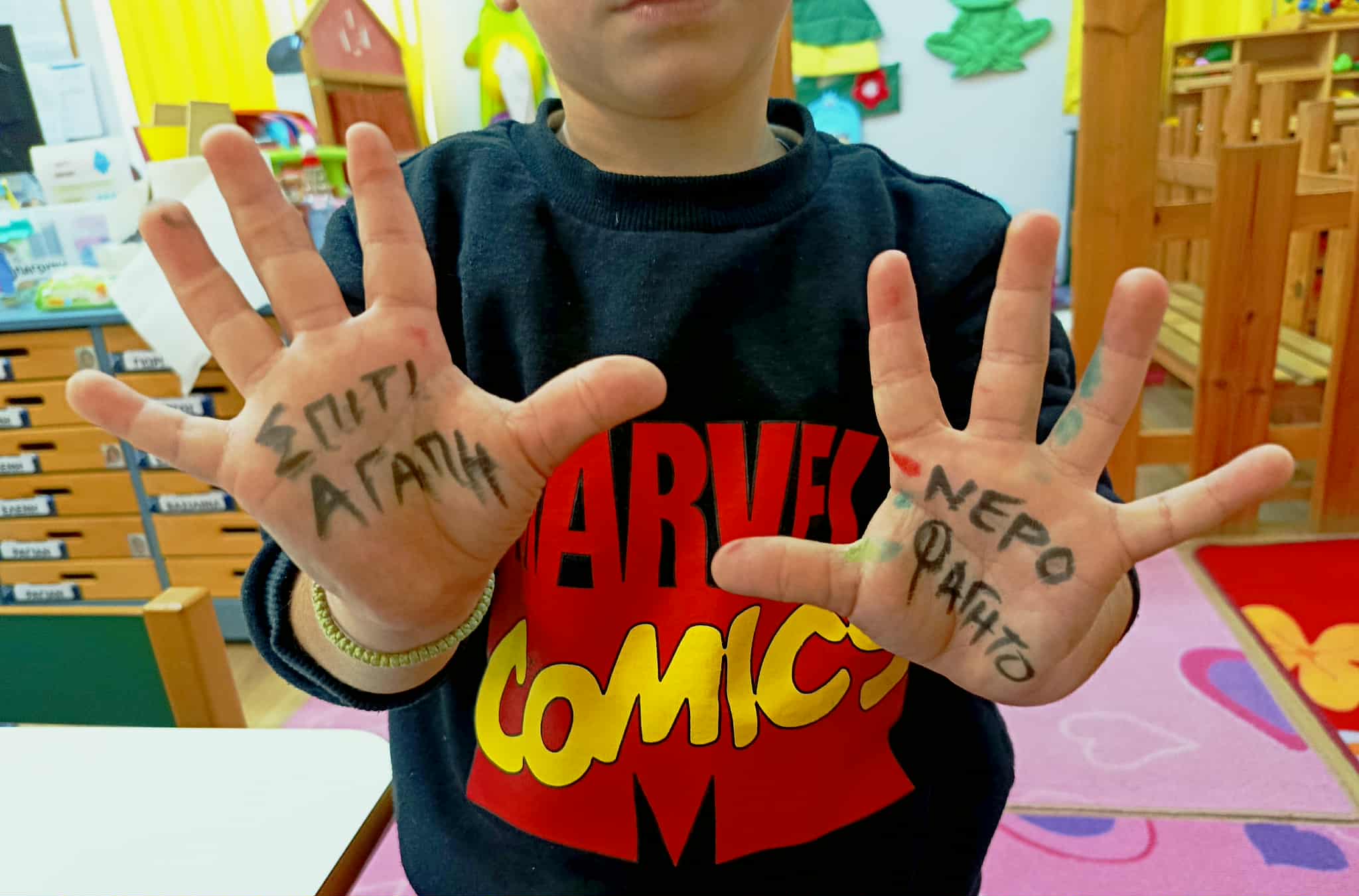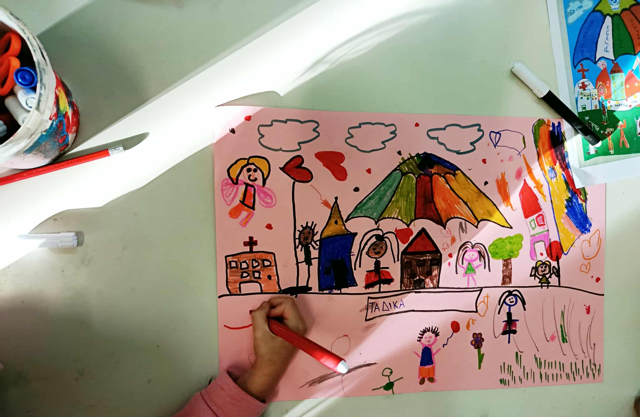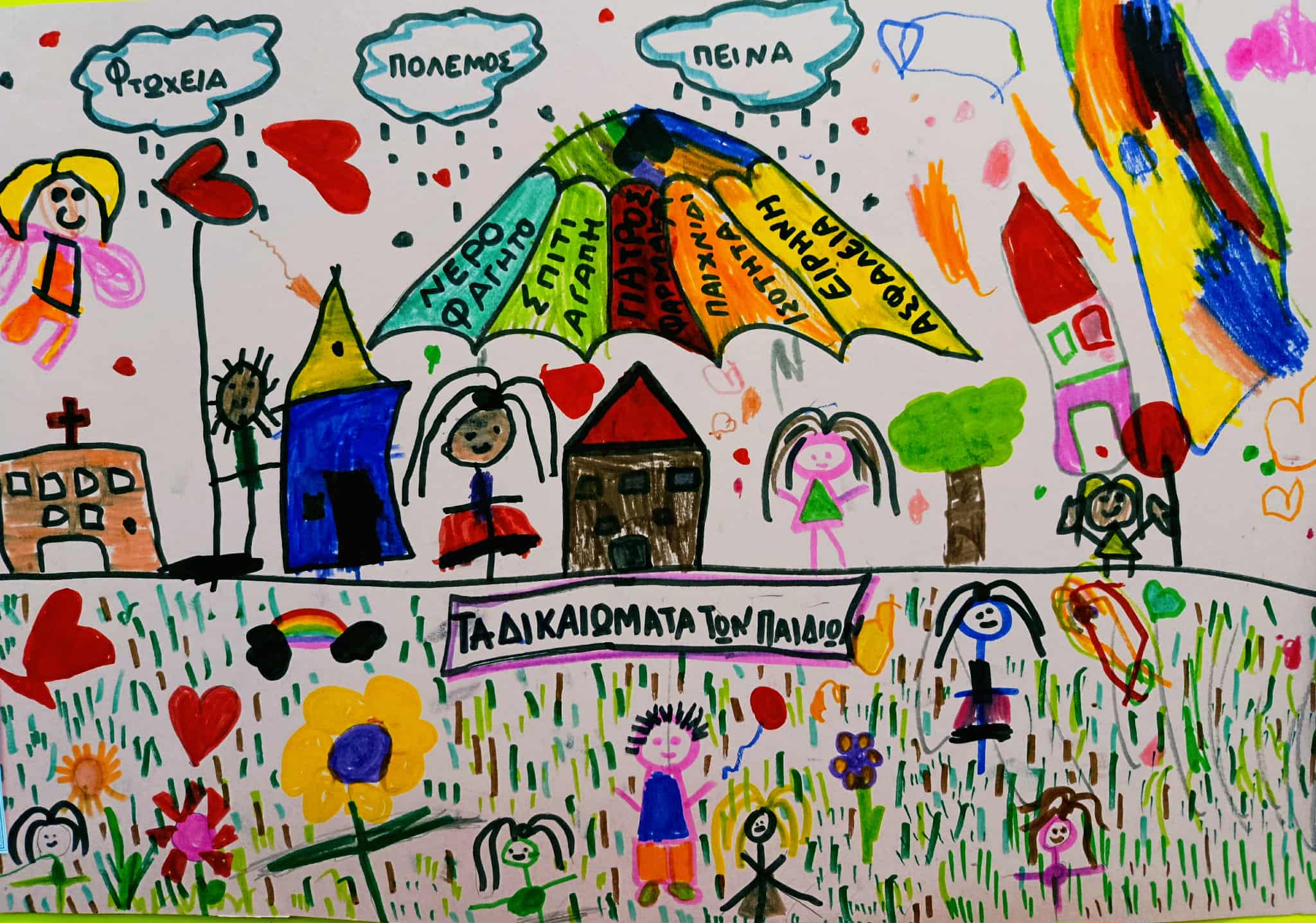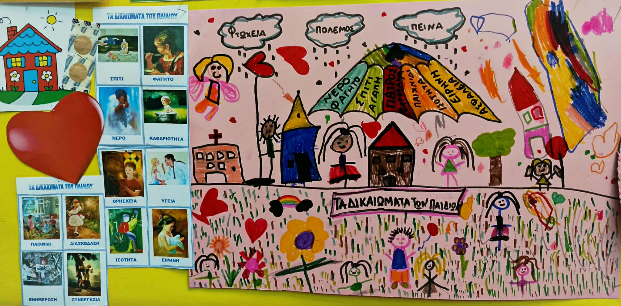 Η κατανόηση επισφραγίστηκε σωματικά και εικαστικά: με το σύνθημα «Στα χεράκια τα απλωμένα, δικαιώματα γραμμένα», τα παιδιά ένιωσαν τα δικαιώματα ως κάτι δικό τους και αδιαπραγμάτευτο, γραμμένο κυριολεκτικά στις παλάμες τους. Η δράση ολοκληρώθηκε με τη ζωγραφιά της «Ομπρέλας των Δικαιωμάτων», που προστατεύει τον γεμάτο χρώμα κόσμο τους από τα γκρίζα σύννεφα της φτώχειας και του πολέμου, περνώντας το σπουδαίο μήνυμα πως ό,τι αποτελεί δικαίωμα δικό τους, ανήκει σε κάθε παιδί της γης και οφείλουμε να το σεβόμαστε.
