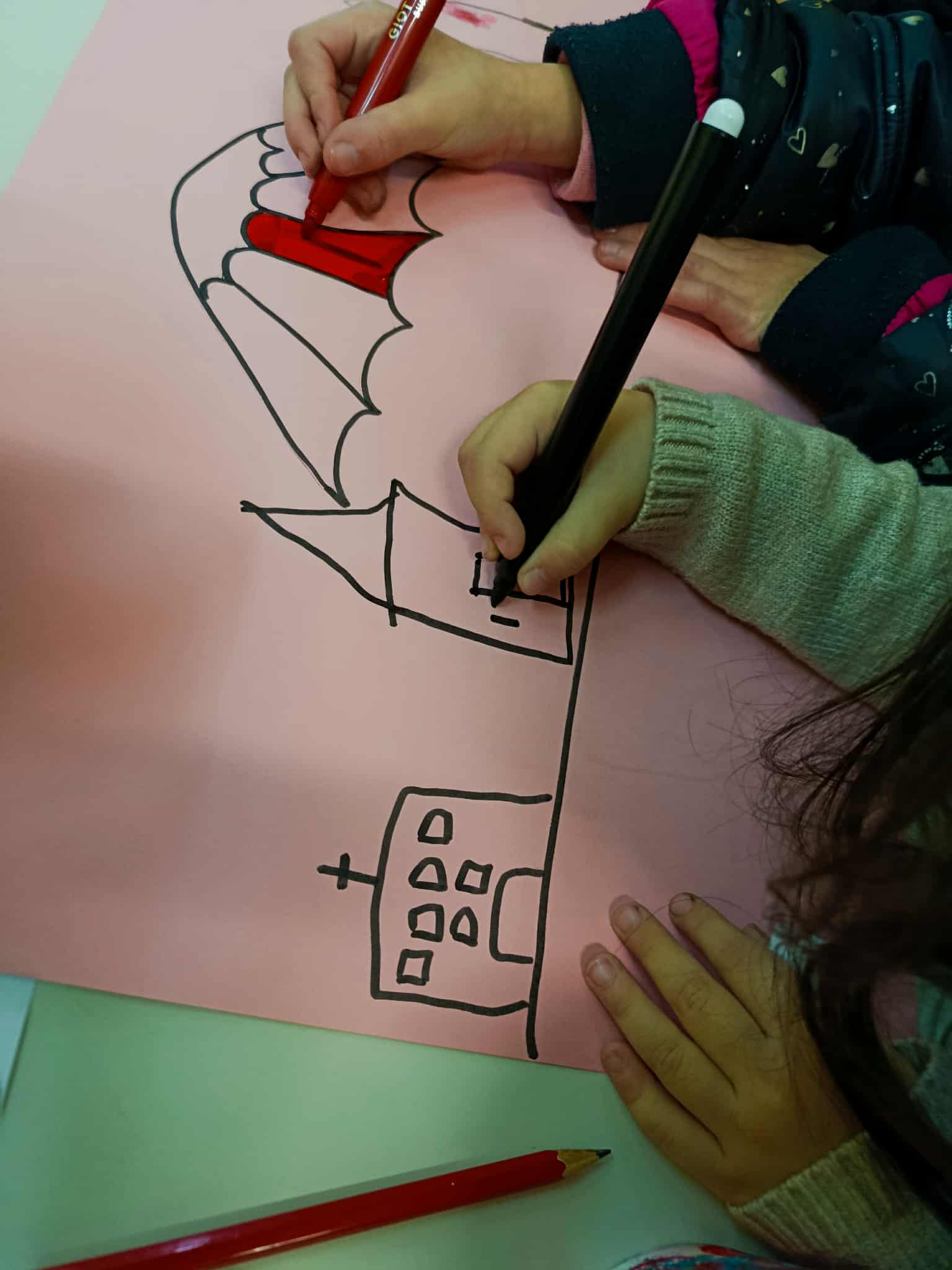 Αντί να ξεχάσουν την εμπειρία, τα παιδιά κλήθηκαν να τη μετατρέψουν σε γνώση. Συγκεκριμένα, μετέφεραν τη συνταγή από τη μνήμη τους στο χαρτί, χρησιμοποιώντας ως μέσο χάρτινες «ποδίτσες» (μαγειρικές ποδιές).