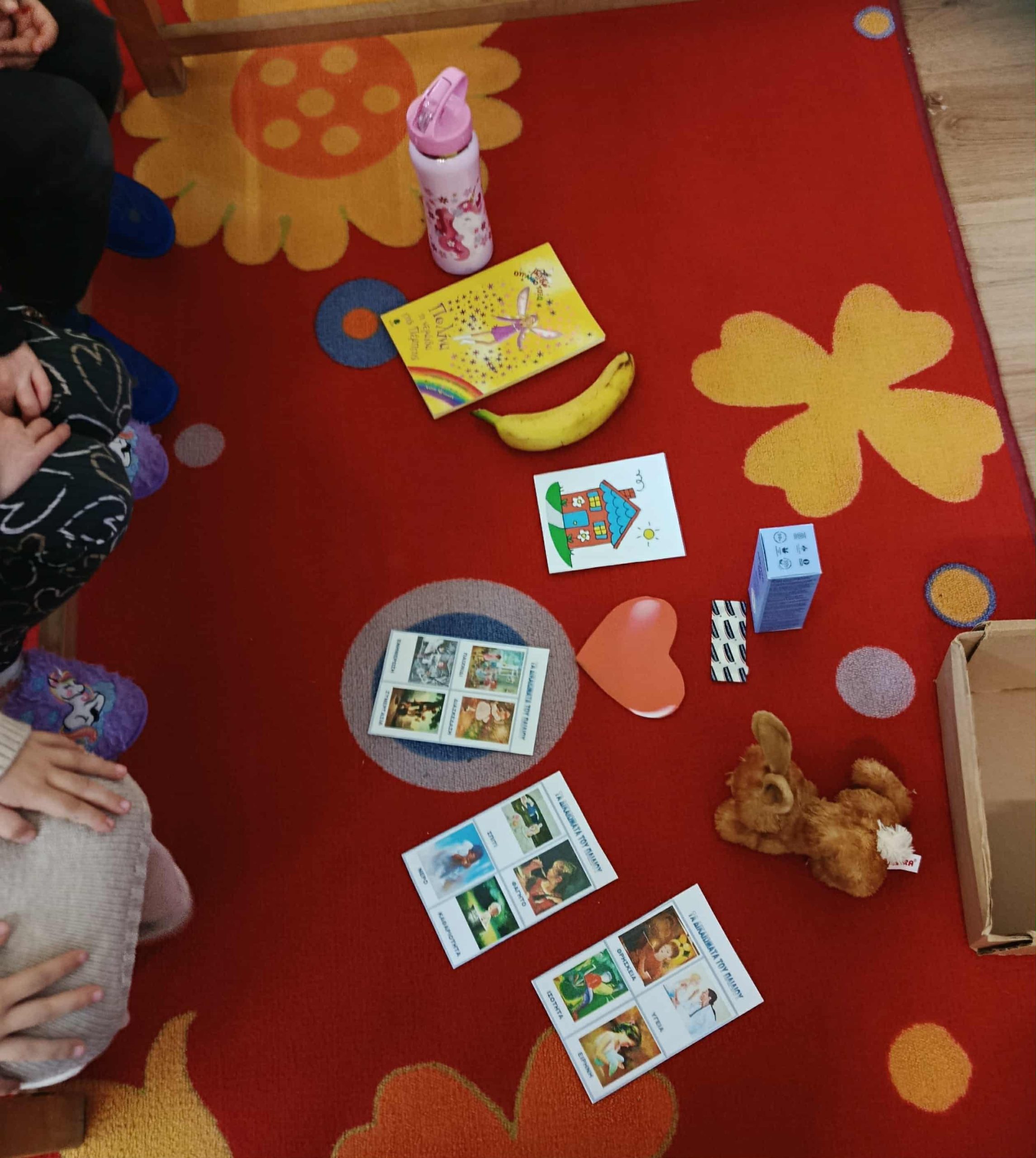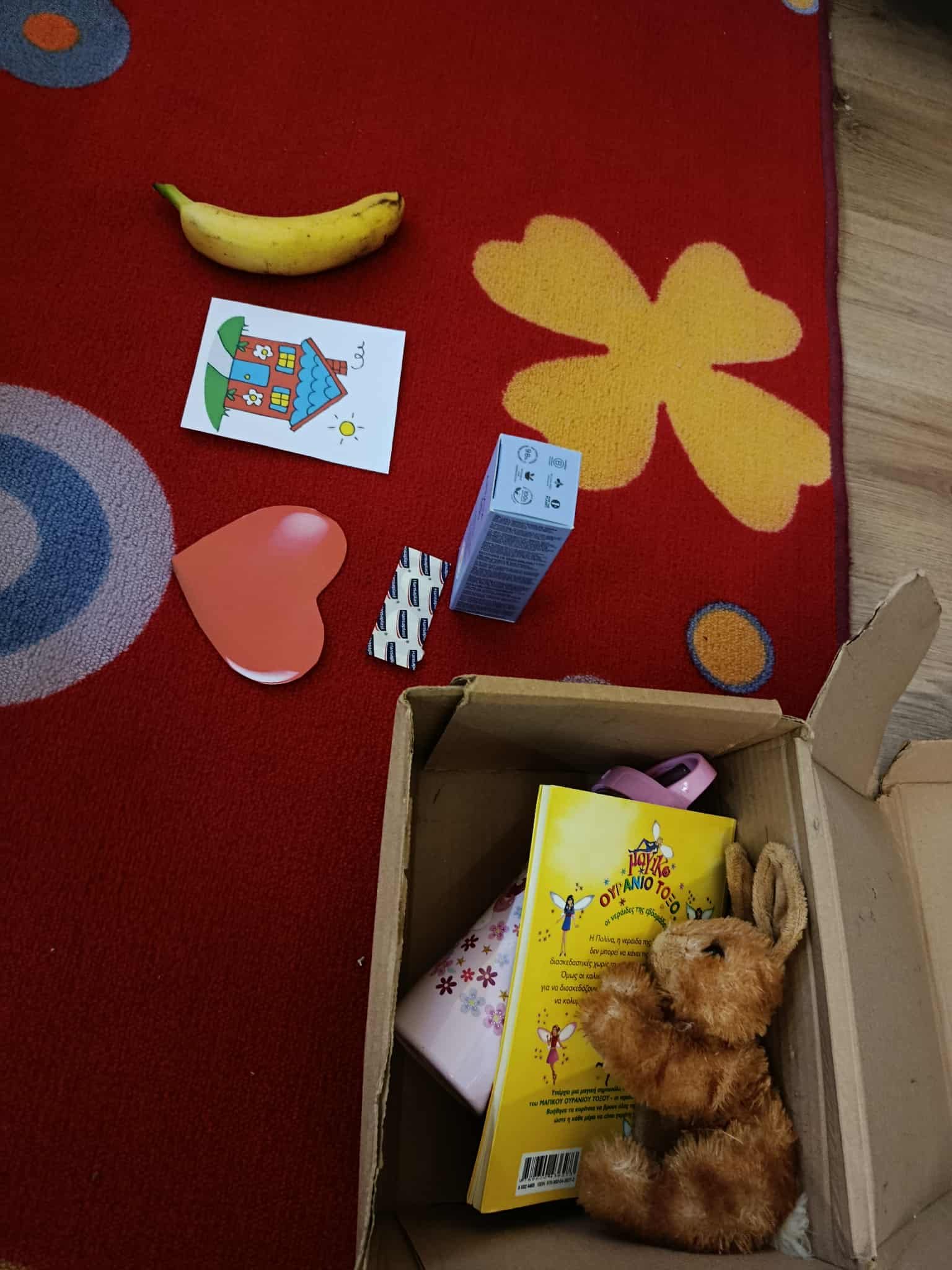 Η προσέγγιση της άγνωστης για τα παιδιά έννοιας του «δικαιώματος» ξεκίνησε βιωματικά, ανοίγοντας ένα κουτί γεμάτο συμβολισμούς. Μέσα από απτά αντικείμενα —ένα σπιτάκι για την οικογενειακή θαλπωρή, μια καρδιά για την αγάπη, τρόφιμα και νερό για την επιβίωση, χάνζαπλαστ για την υγεία, ένα βιβλίο για τη μόρφωση και ένα λούτρινο λαγουδάκι για το παιχνίδι— τα νήπια συνέδεσαν τις καθημερινές τους ανάγκες με τη λέξη «δικαίωμα», αναγνωρίζοντας παράλληλα την Ειρήνη ως το θεμέλιο για να υπάρξουν όλα τα παραπάνω.