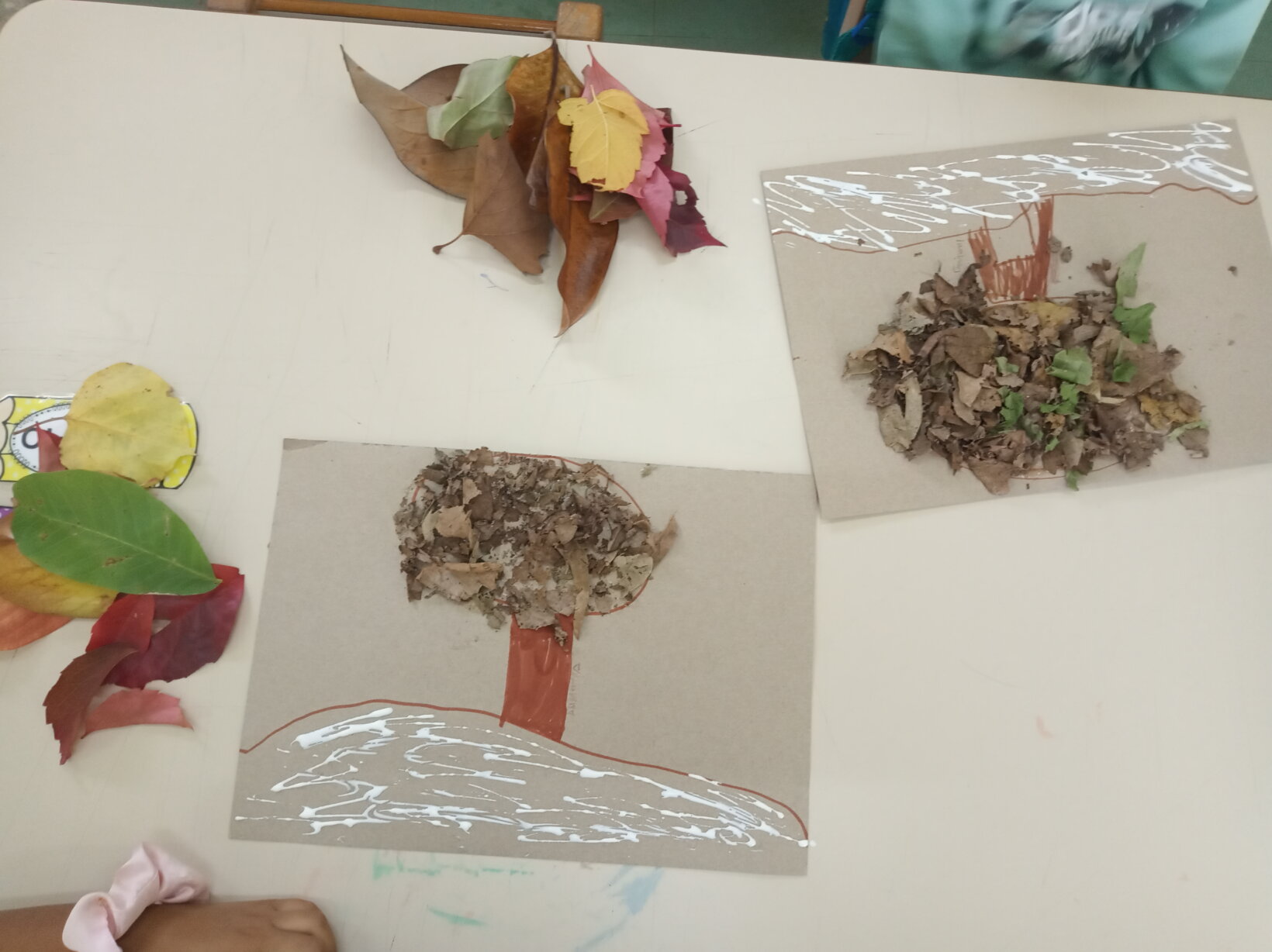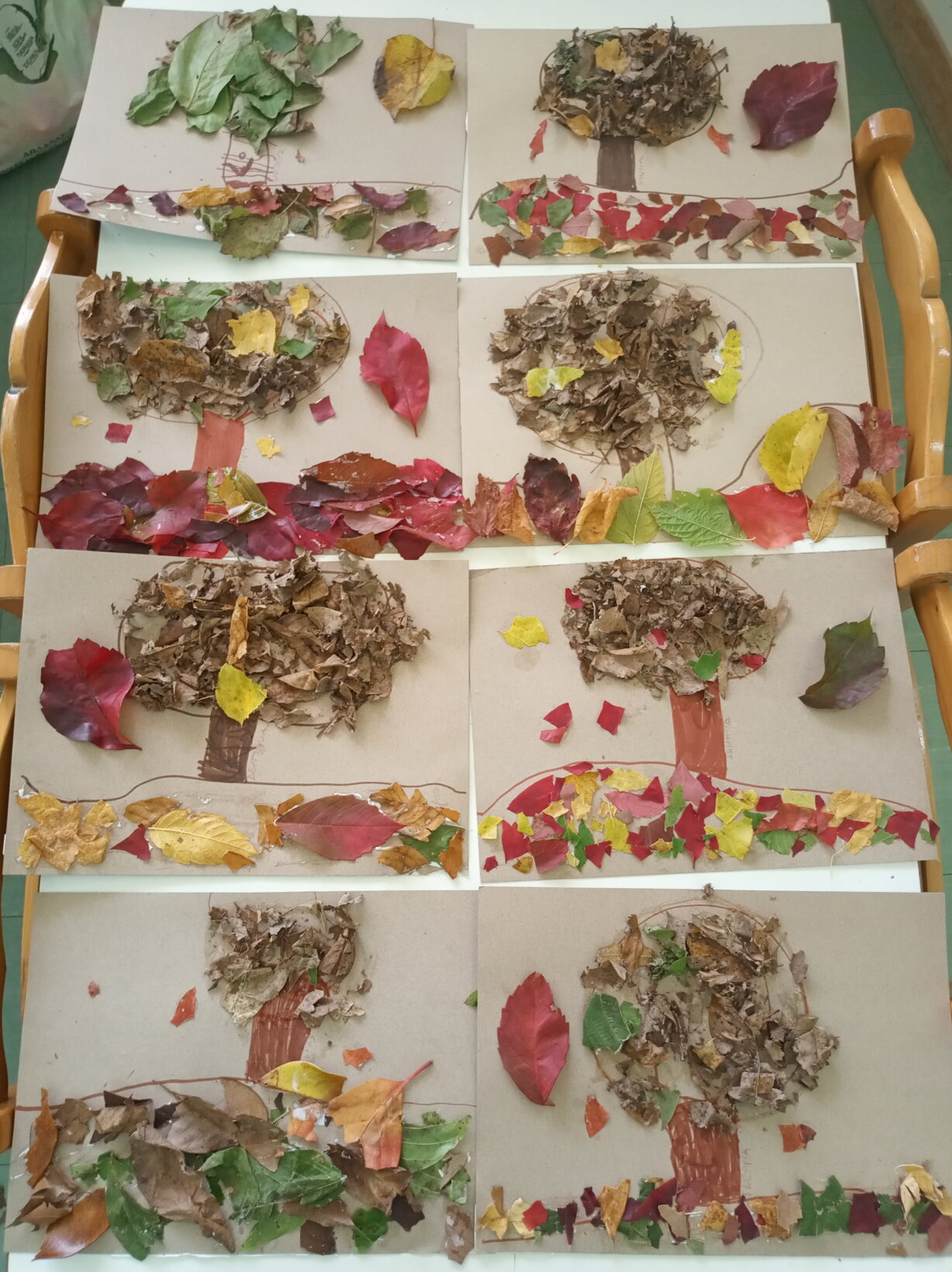 Τα παιδιά μαζεύουν ξερά φύλλα από την αυλή, χωρίζονται σε ομάδες και θρυμματίζουν τα φύλλα. Στη συνέχεια σχεδιάζουν ένα δέντρο, χρωματίζουν μόνο τον κορμό και κολλάνε τα κομμάτια ξερών φύλλων στο δέντρο.